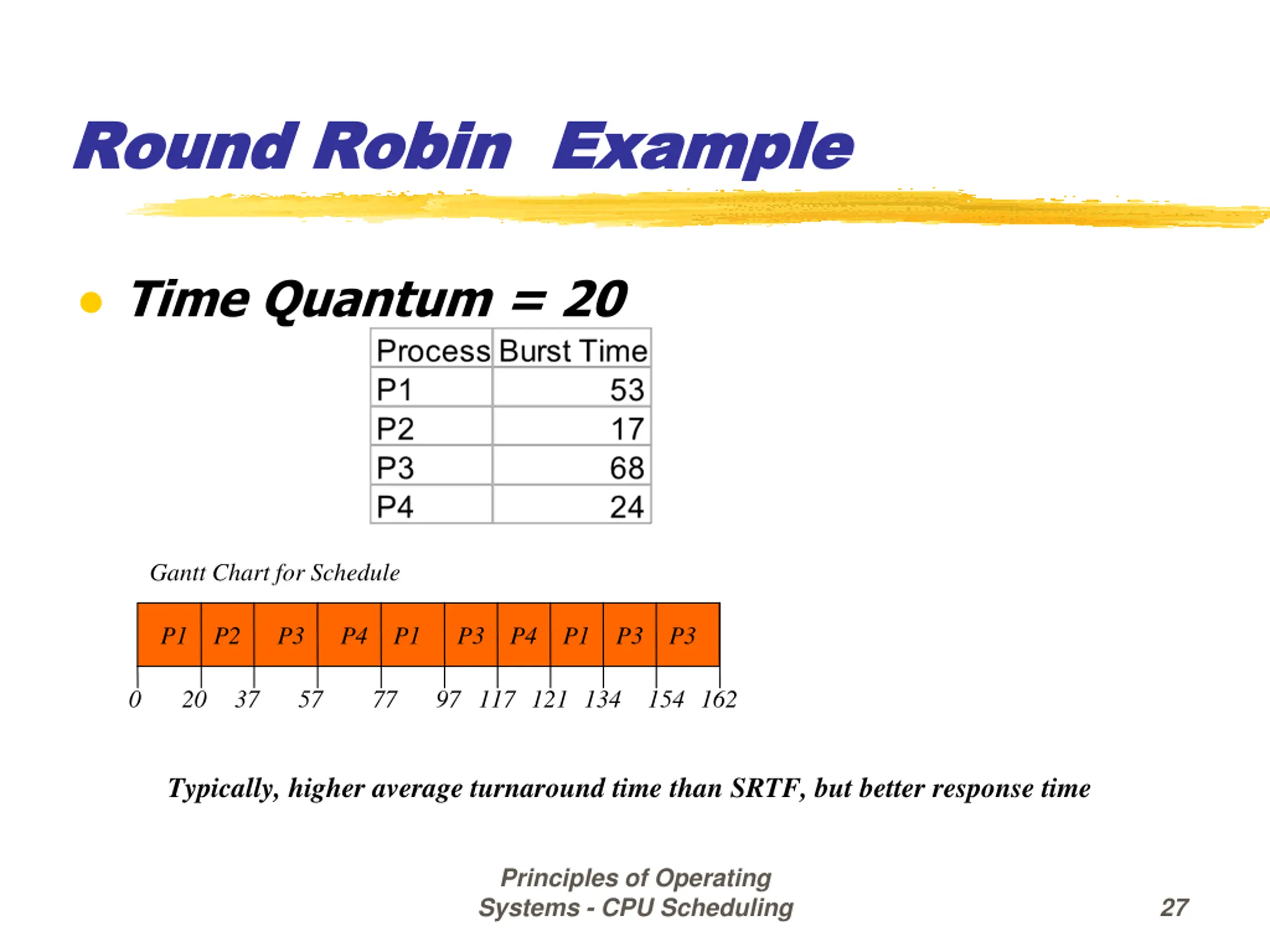 Round Robin Example Round Robin Example Time Quantum = 20 Gantt Chart for Schedule P1 P2 P3 P4 P1 P3 P4 P1 P3 P3 0 20 37 57 77 97 117 121 134 154 162 Typically, higher average turnaround time than SRTF, but better response time Principles of Operating Systems - CPU Scheduling 27