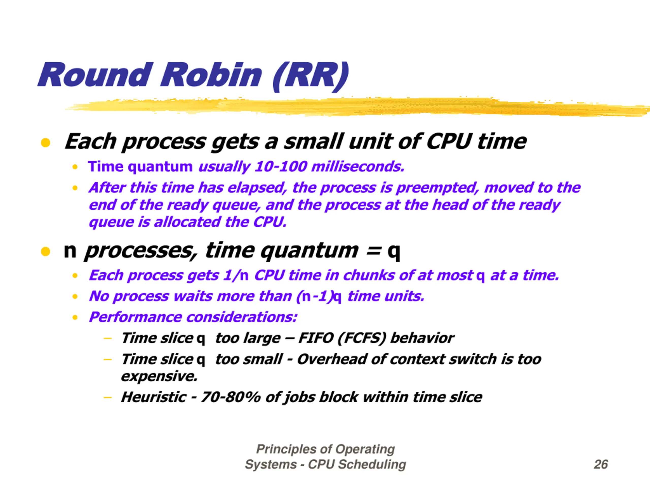 Round Robin (RR) Round Robin (RR) Each process gets a small unit of CPU time Time quantum usually 10-100 milliseconds. After this time has elapsed, the process is preempted, moved to the end of the ready queue, and the process at the head of the ready queue is allocated the CPU. n processes, time quantum = q Each process gets 1/n CPU time in chunks of at most q at a time. No process waits more than (n-1)q time units. Performance considerations: Time slice q too large FIFO (FCFS) behavior Time slice q too small - Overhead of context switch is too expensive. Heuristic - 70-80% of jobs block within time slice Principles of Operating Systems - CPU Scheduling 26