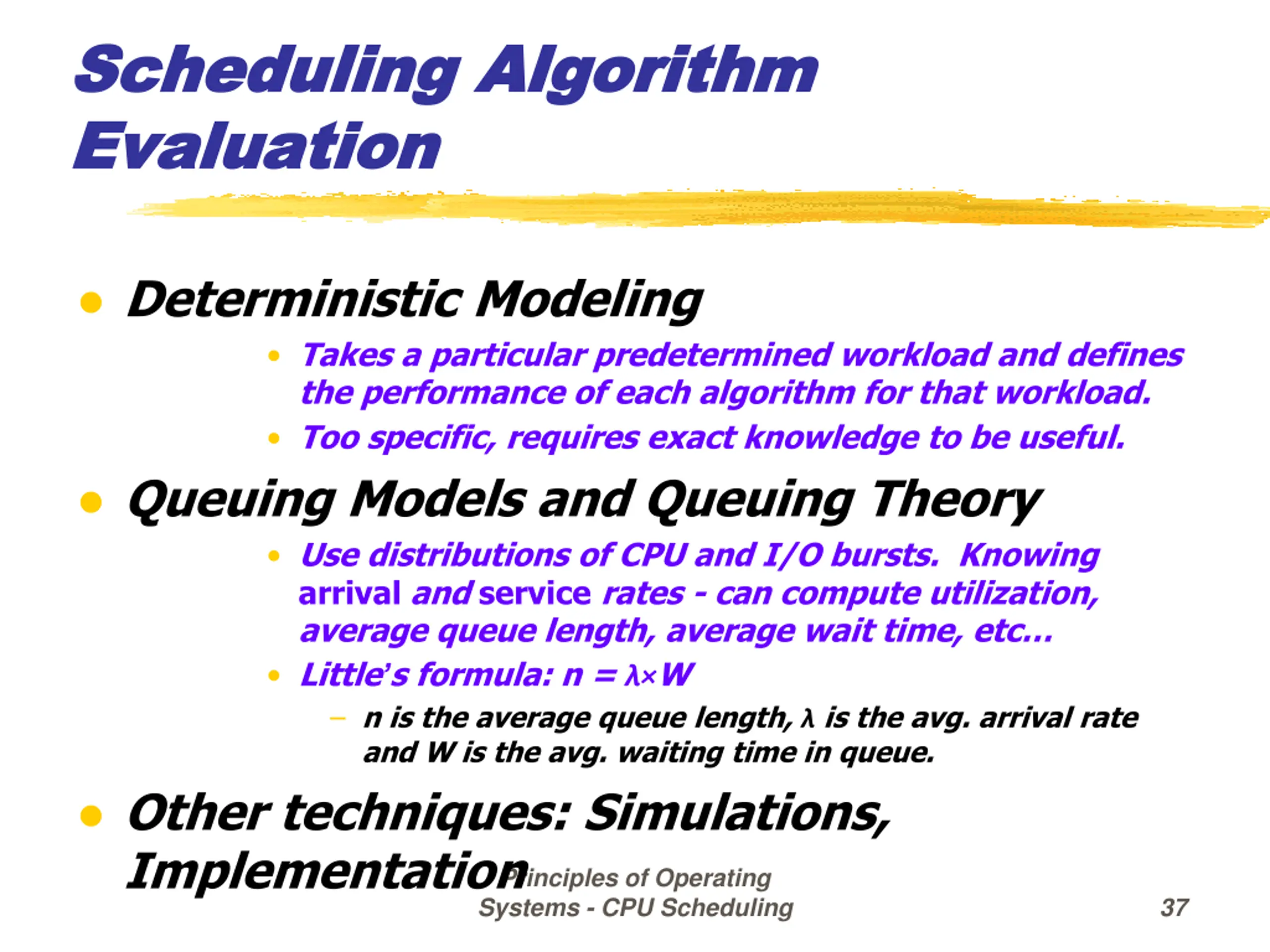 Scheduling Algorithm Scheduling Algorithm Evaluation Evaluation Deterministic Modeling Takes a particular predetermined workload and defines the performance of each algorithm for that workload. Too specific, requires exact knowledge to be useful. Queuing Models and Queuing Theory Use distributions of CPU and I/O bursts. Knowing arrival and service rates - can compute utilization, average queue length, average wait time, etc Little s formula: n = W n is the average queue length, is the avg. arrival rate and W is the avg. waiting time in queue. Other techniques: Simulations, Implementation Principles of Operating Systems - CPU Scheduling 37