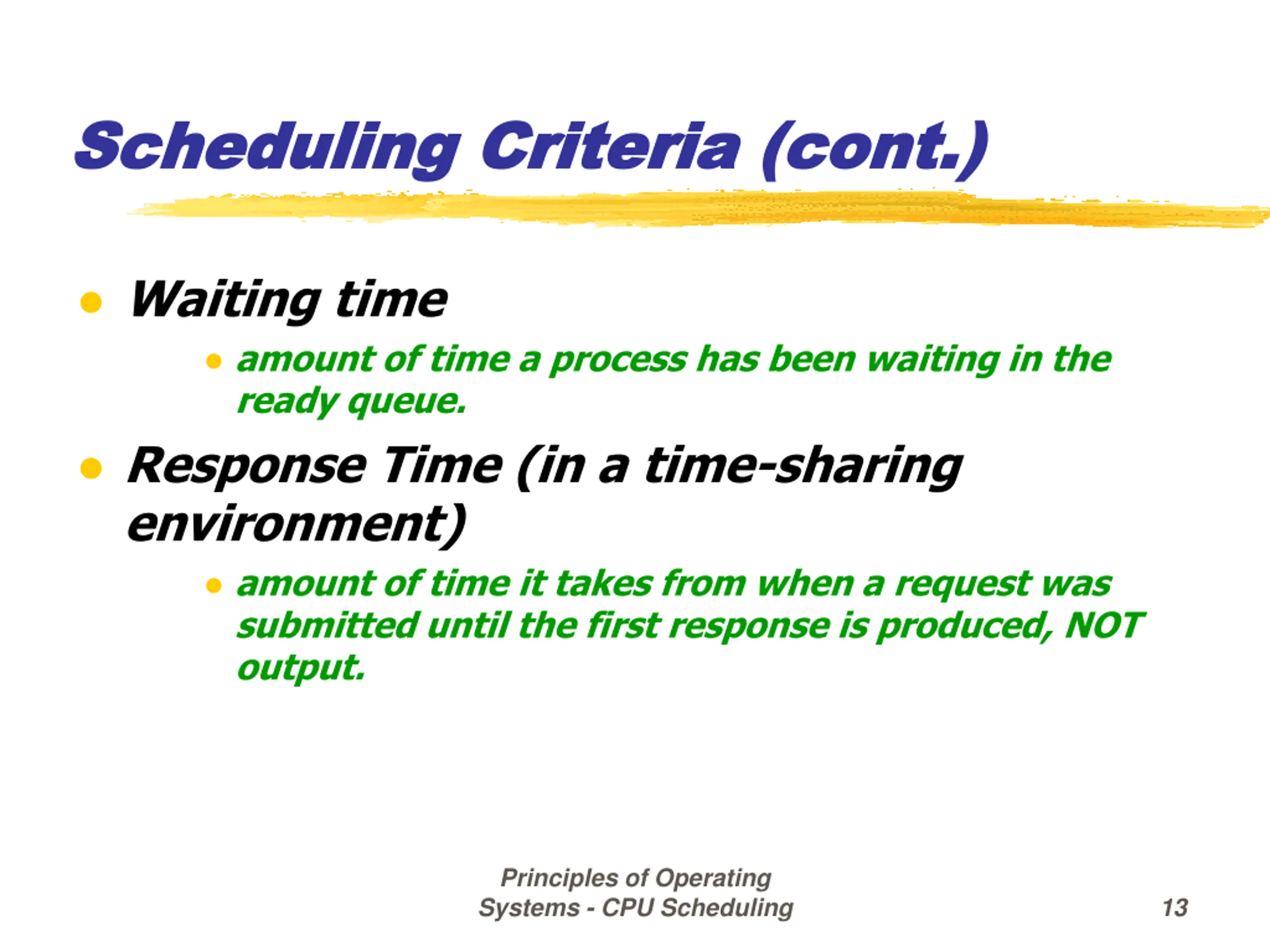 Scheduling Criteria (cont.) Scheduling Criteria (cont.) Waiting time amount of time a process has been waiting in the ready queue. Response Time (in a time-sharing environment) amount of time it takes from when a request was submitted until the first response is produced, NOT output. Principles of Operating Systems - CPU Scheduling 13