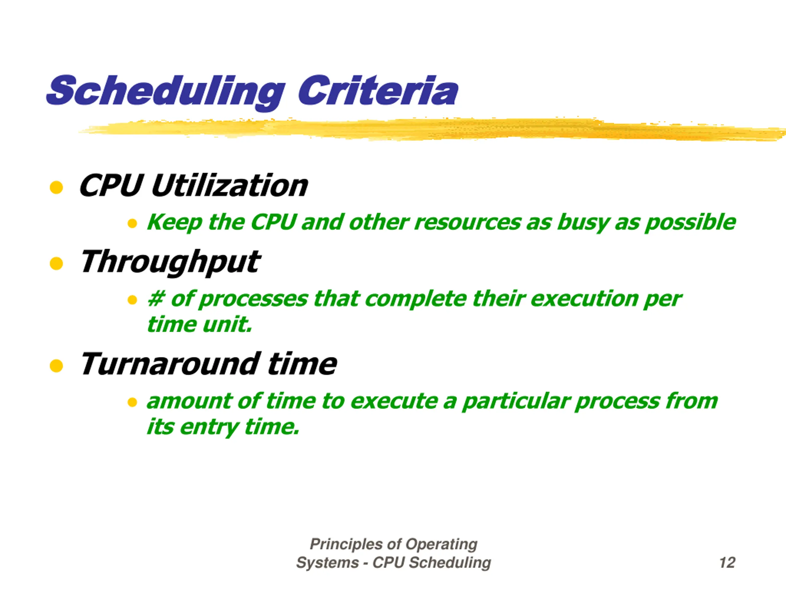 Scheduling Criteria Scheduling Criteria CPU Utilization Keep the CPU and other resources as busy as possible Throughput # of processes that complete their execution per time unit. Turnaround time amount of time to execute a particular process from its entry time. Principles of Operating Systems - CPU Scheduling 12