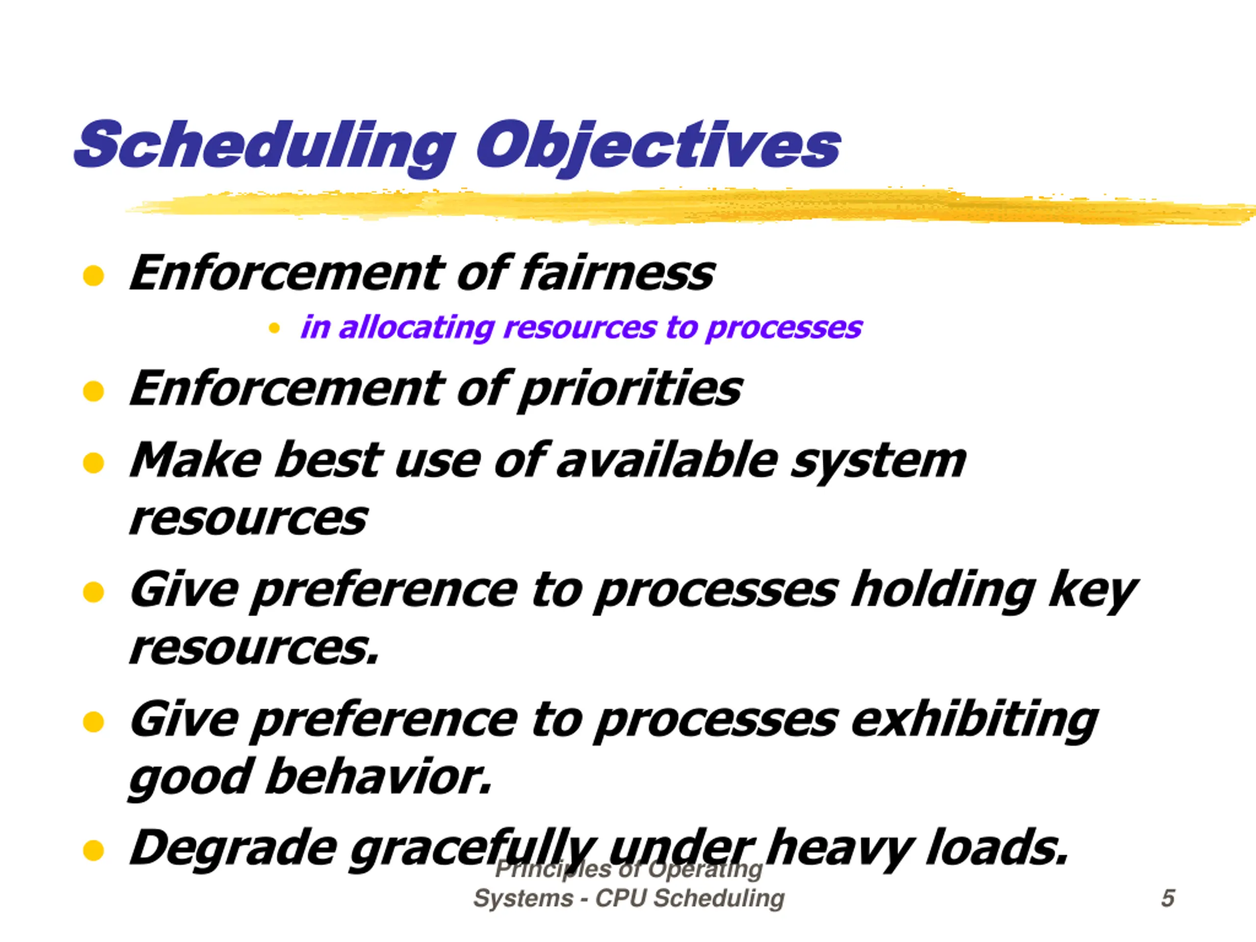 Scheduling Objectives Scheduling Objectives Enforcement of fairness in allocating resources to processes Enforcement of priorities Make best use of available system resources Give preference to processes holding key resources. Give preference to processes exhibiting good behavior. Degrade gracefully under heavy loads. Principles of Operating Systems - CPU Scheduling 5