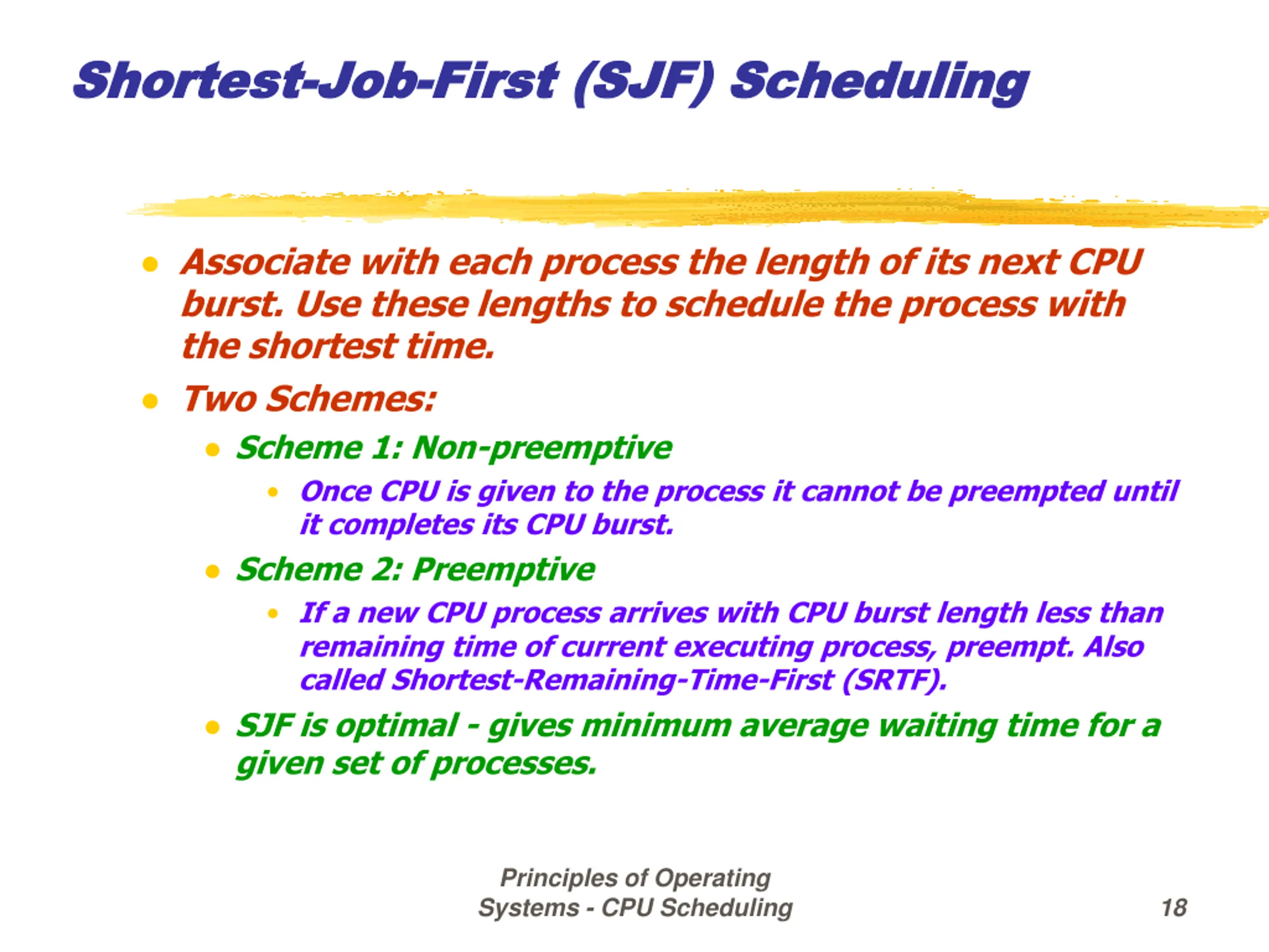 Shortest Shortest- -Job Job- -First (SJF) Scheduling First (SJF) Scheduling Associate with each process the length of its next CPU burst. Use these lengths to schedule the process with the shortest time. Two Schemes: Scheme 1: Non-preemptive Once CPU is given to the process it cannot be preempted until it completes its CPU burst. Scheme 2: Preemptive If a new CPU process arrives with CPU burst length less than remaining time of current executing process, preempt. Also called Shortest-Remaining-Time-First (SRTF). SJF is optimal - gives minimum average waiting time for a given set of processes. Principles of Operating Systems - CPU Scheduling 18