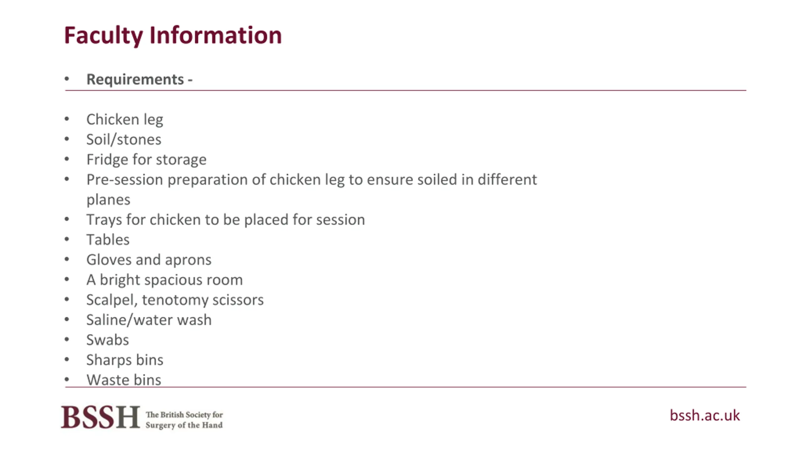 Faculty Information Requirements - Chicken leg Soil/stones Fridge for storage Pre-session preparation of chicken leg to ensure soiled in different planes Trays for chicken to be placed for session Tables Gloves and aprons A bright spacious room Scalpel, tenotomy scissors Saline/water wash Swabs Sharps bins Waste bins bssh.ac.uk