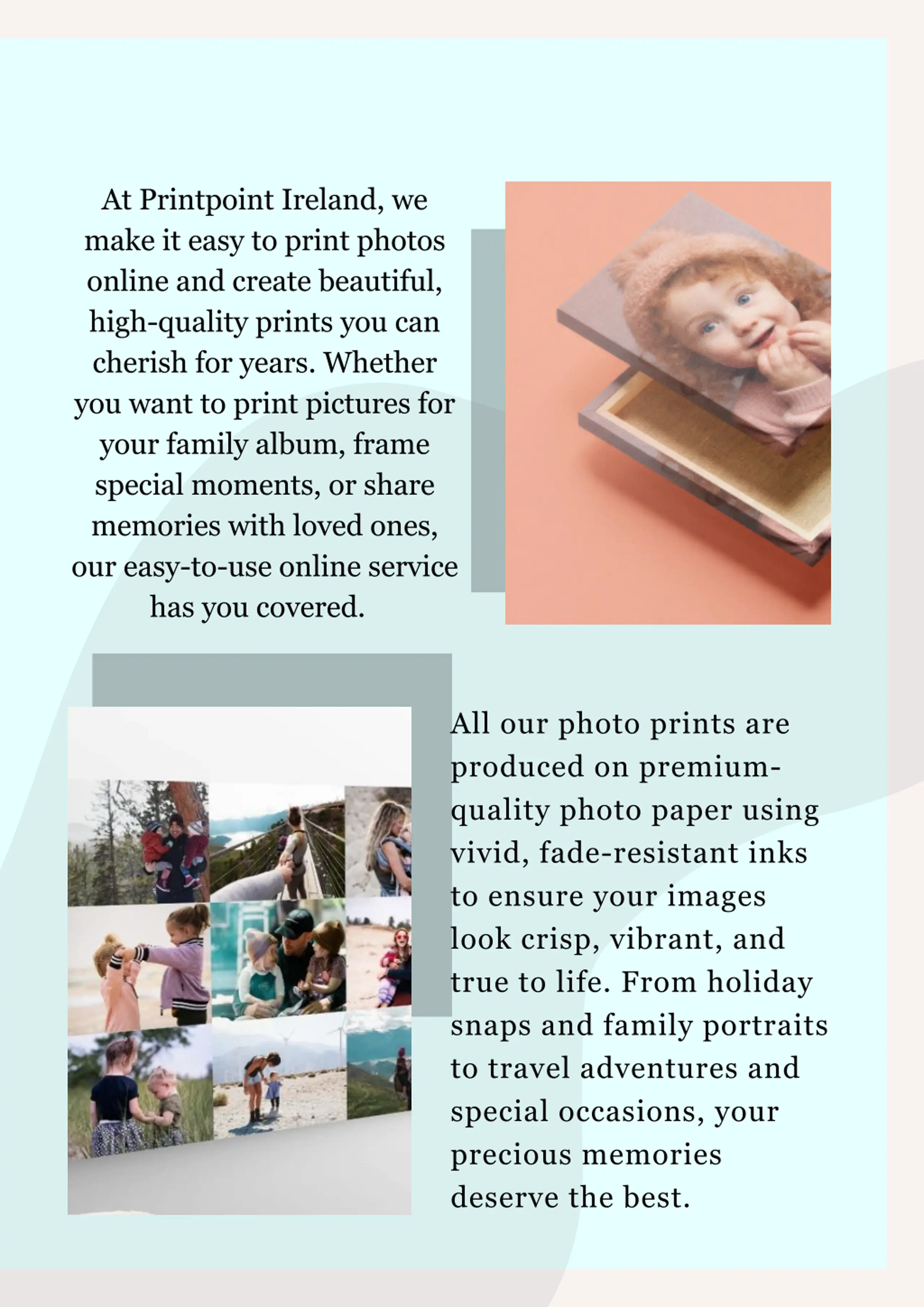 nPrint Photos Online easily with Printpoint Ireland. Turn your favourite memories into beautiful, high-quality photo prints using vivid, fade-resistant inks and premium photo paper. Perfect for albums, frames, or thoughtful gifts, your prints arrive