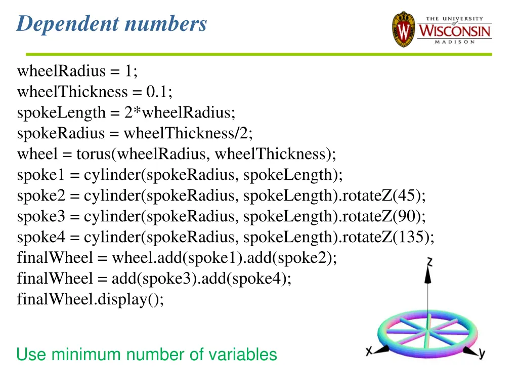 Dependent numbers wheelRadius = 1; wheelThickness = 0.1; spokeLength = 2*wheelRadius; spokeRadius = wheelThickness/2; wheel = torus(wheelRadius, wheelThickness); spoke1 = cylinder(spokeRadius, spokeLength); spoke2 = cylinder(spokeRadius, spokeLength).rotateZ(45); spoke3 = cylinder(spokeRadius, spokeLength).rotateZ(90); spoke4 = cylinder(spokeRadius, spokeLength).rotateZ(135); finalWheel = wheel.add(spoke1).add(spoke2); finalWheel = add(spoke3).add(spoke4); finalWheel.display(); Use minimum number of variables
