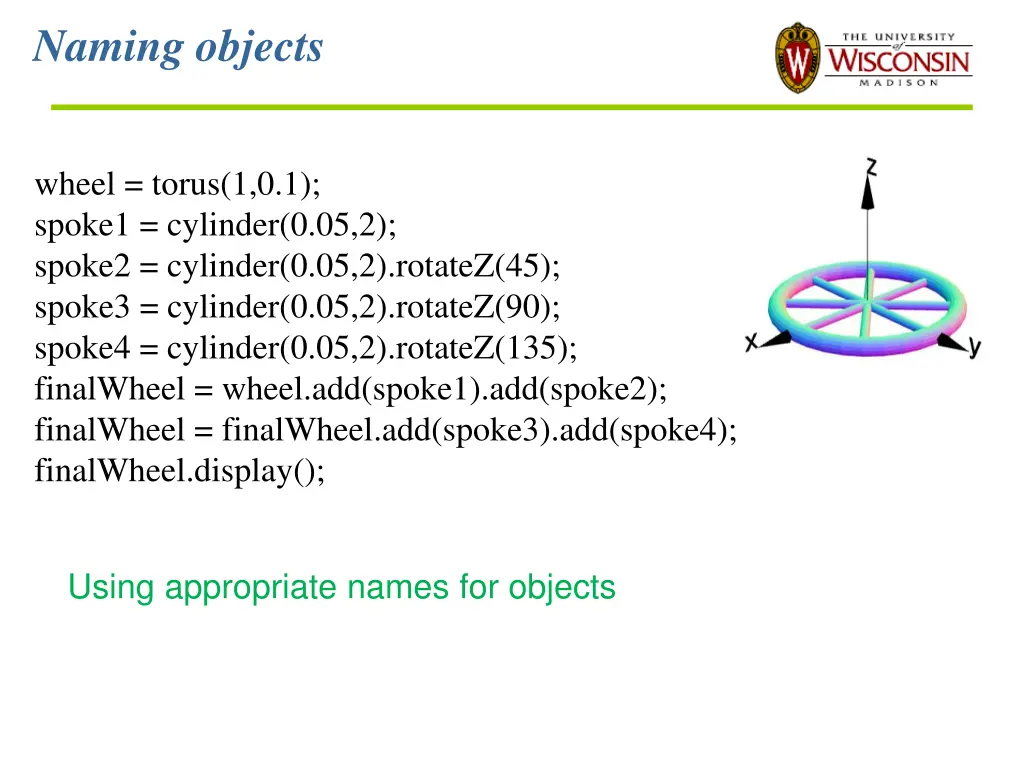 Naming objects and numbers wheelRadius = 1; wheelThickness = 0.1; spokeLength = 2; spokeRadius = 0.05; wheel = torus(wheelRadius, wheelThickness); spoke1 = cylinder(spokeRadius, spokeLength); spoke2 = cylinder(spokeRadius, spokeLength).rotateZ(45); spoke3 = cylinder(spokeRadius, spokeLength).rotateZ(90); spoke4 = cylinder(spokeRadius, spokeLength).rotateZ(135); finalWheel = wheel.add(spoke1).add(spoke2); finalWheel = add(spoke3).add(spoke4); finalWheel.display(); Code is longer but easier to understand