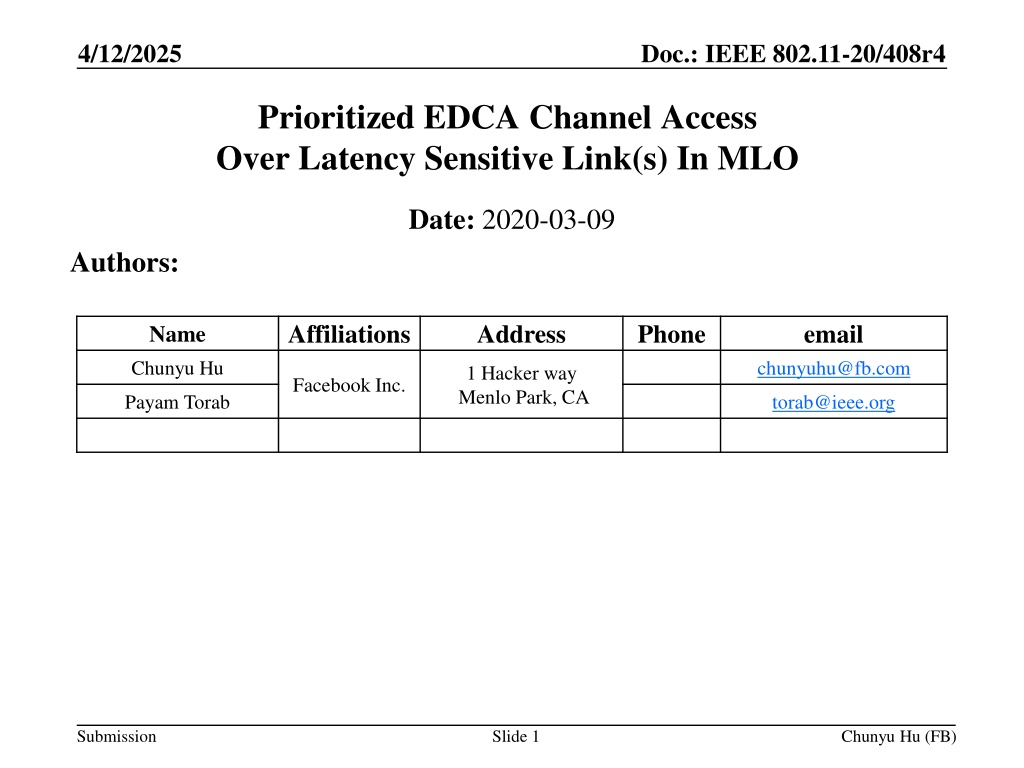 4/12/2025 Doc.: IEEE 802.11-20/408r4 Prioritized EDCA Channel Access Over Latency Sensitive Link(s) In MLO Date: 2020-03-09 Authors: Affiliations Address Phone email Name Chunyu Hu chunyuhu@fb.com 1 Hacker way Menlo Park, CA Facebook Inc. Payam Torab torab@ieee.org Submission Slide 1 Chunyu Hu (FB)
