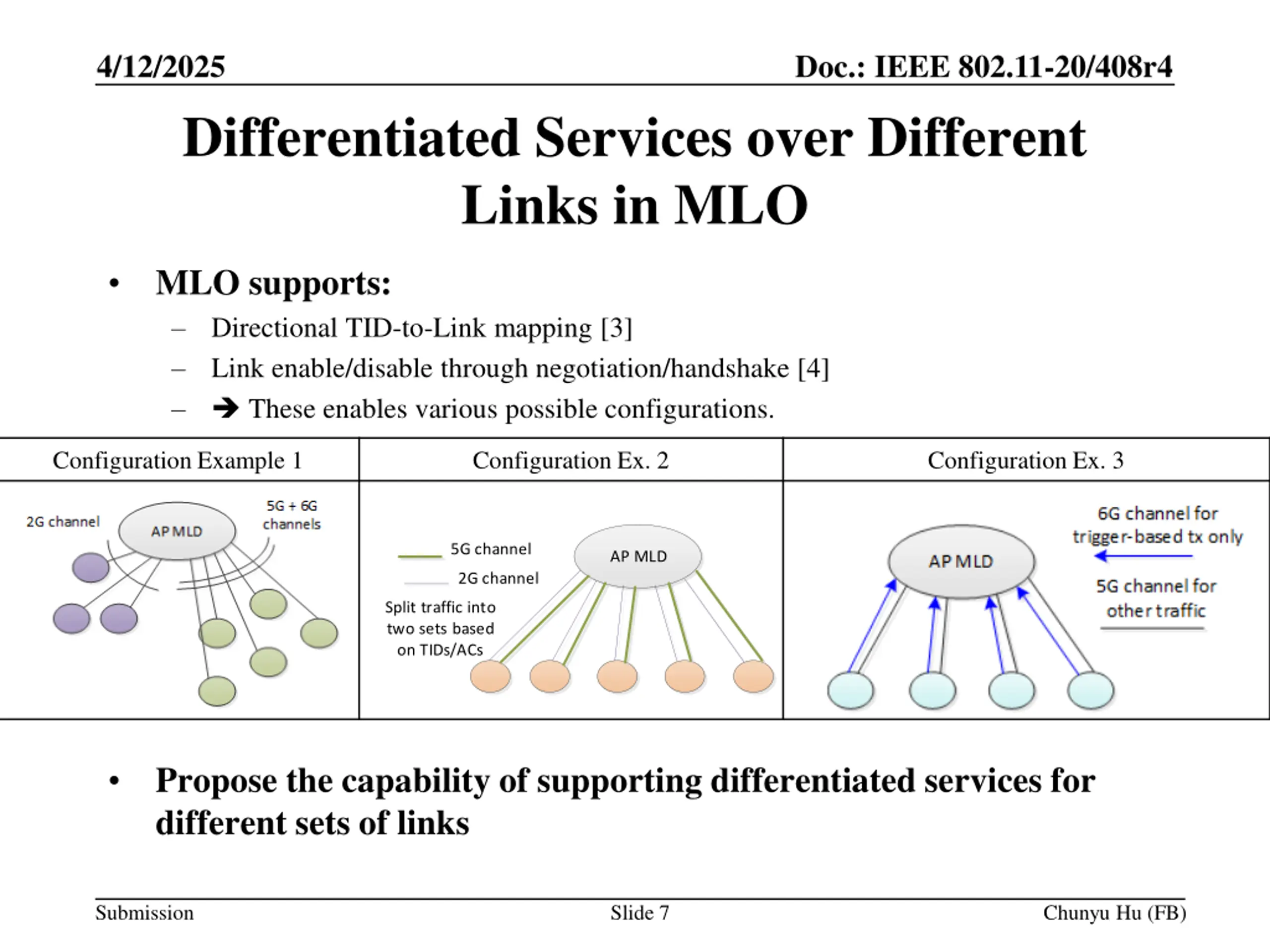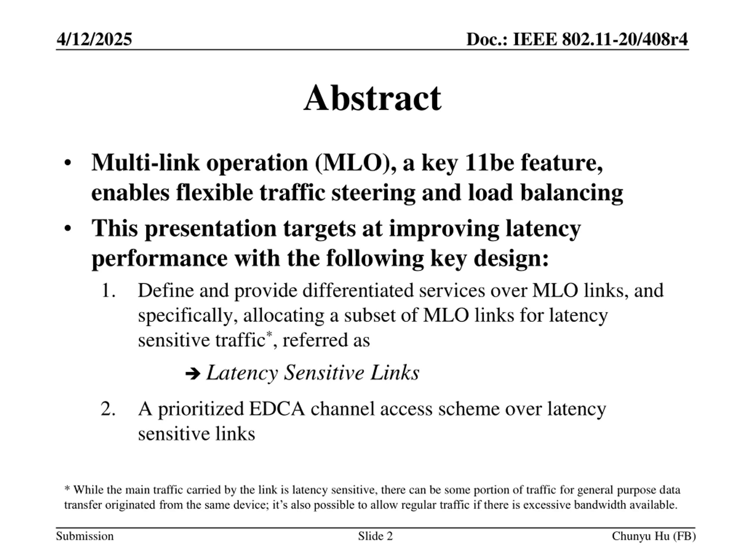 4/12/2025 Doc.: IEEE 802.11-20/408r4 Abstract Multi-link operation (MLO), a key 11be feature, enables flexible traffic steering and load balancing This presentation targets at improving latency performance with the following key design: 1. Define and provide differentiated services over MLO links, and specifically, allocating a subset of MLO links for latency sensitive traffic*, referred as Latency Sensitive Links 2. A prioritized EDCA channel access scheme over latency sensitive links * While the main traffic carried by the link is latency sensitive, there can be some portion of traffic for general purpose data transfer originated from the same device; it s also possible to allow regular traffic if there is excessive bandwidth available. Submission Slide 2 Chunyu Hu (FB)