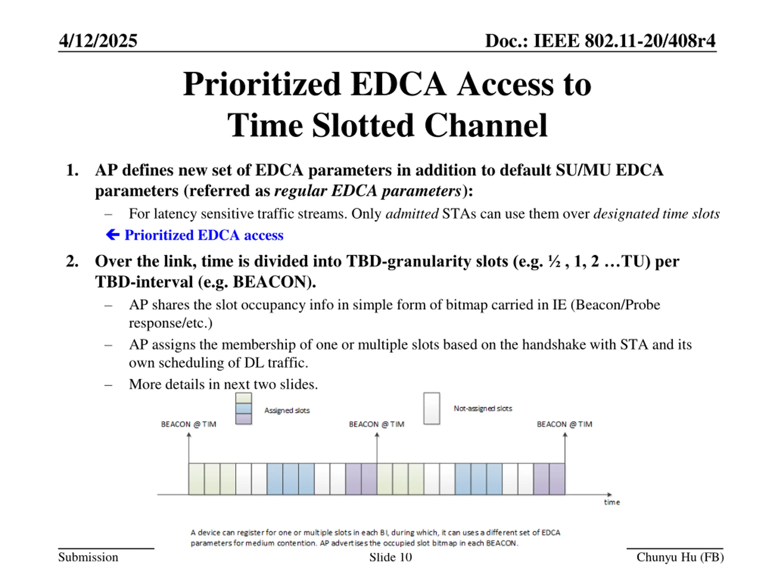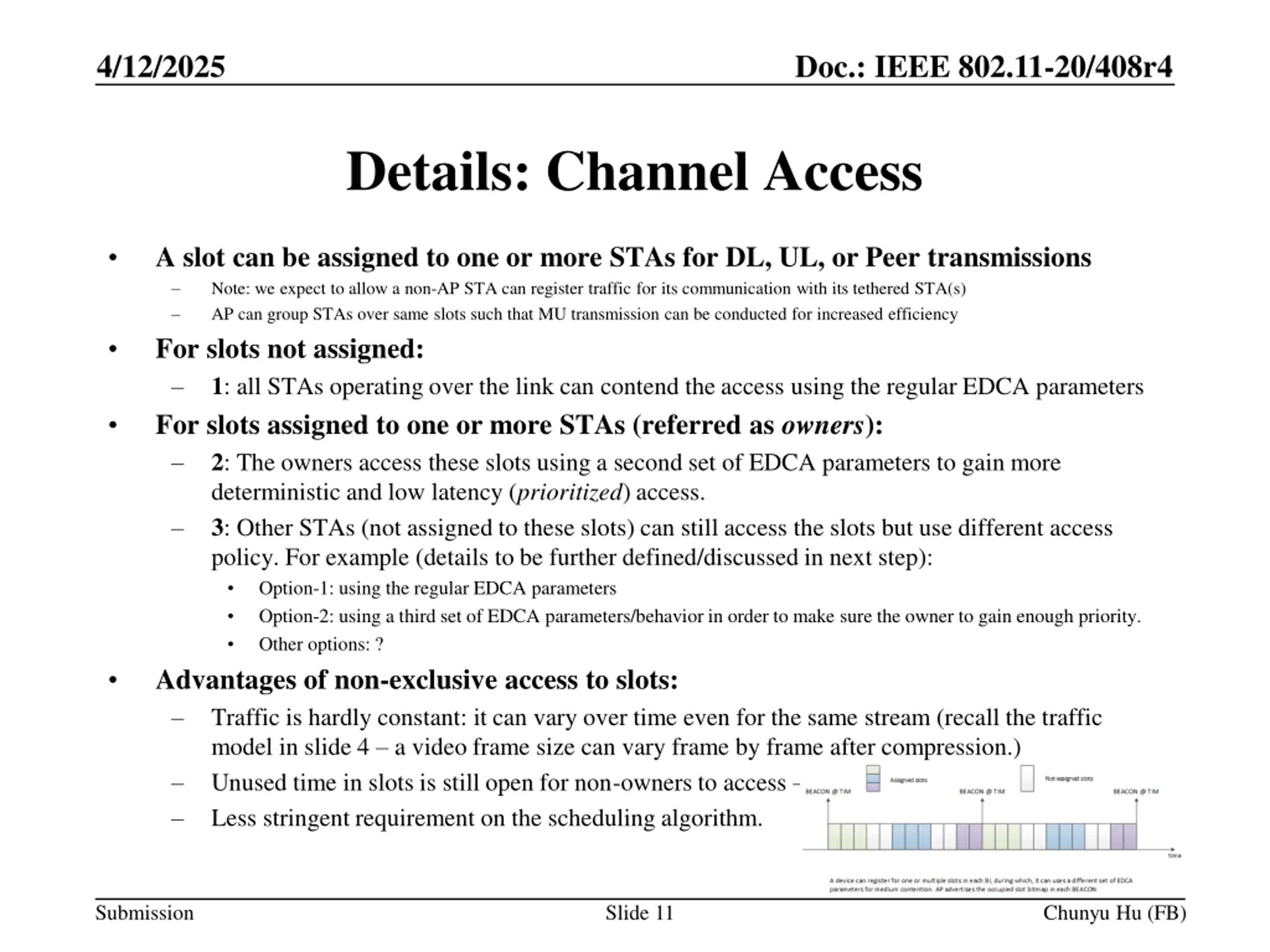 4/12/2025 Doc.: IEEE 802.11-20/408r4 Prioritized EDCA Access to Time Slotted Channel 1. AP defines new set of EDCA parameters in addition to default SU/MU EDCA parameters (referred as regular EDCA parameters): For latency sensitive traffic streams. Only admitted STAs can use them over designated time slots Prioritized EDCA access Over the link, time is divided into TBD-granularity slots (e.g. , 1, 2 TU) per TBD-interval (e.g. BEACON). AP shares the slot occupancy info in simple form of bitmap carried in IE (Beacon/Probe response/etc.) AP assigns the membership of one or multiple slots based on the handshake with STA and its own scheduling of DL traffic. More details in next two slides. 2. Submission Slide 10 Chunyu Hu (FB)