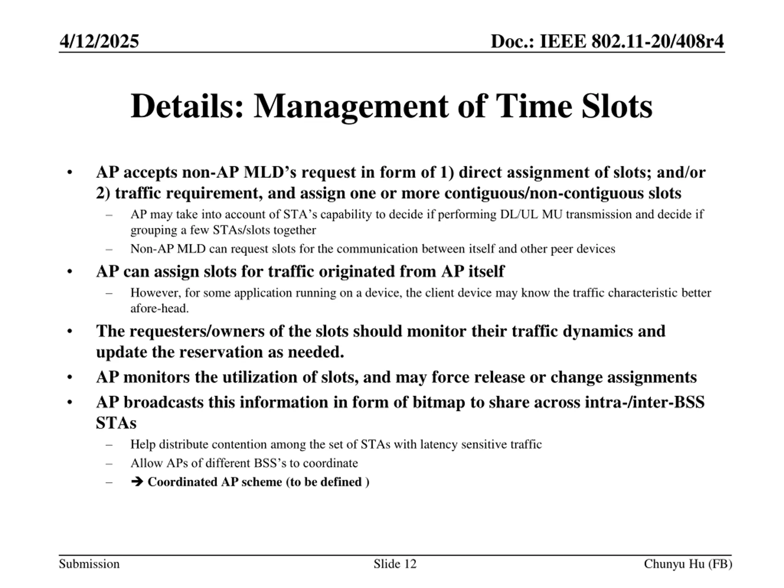 4/12/2025 Doc.: IEEE 802.11-20/408r4 Details: Management of Time Slots AP accepts non-AP MLD s request in form of 1) direct assignment of slots; and/or 2) traffic requirement, and assign one or more contiguous/non-contiguous slots AP may take into account of STA s capability to decide if performing DL/UL MU transmission and decide if grouping a few STAs/slots together Non-AP MLD can request slots for the communication between itself and other peer devices AP can assign slots for traffic originated from AP itself However, for some application running on a device, the client device may know the traffic characteristic better afore-head. The requesters/owners of the slots should monitor their traffic dynamics and update the reservation as needed. AP monitors the utilization of slots, and may force release or change assignments AP broadcasts this information in form of bitmap to share across intra-/inter-BSS STAs Help distribute contention among the set of STAs with latency sensitive traffic Allow APs of different BSS s to coordinate Coordinated AP scheme (to be defined ) Submission Slide 12 Chunyu Hu (FB)