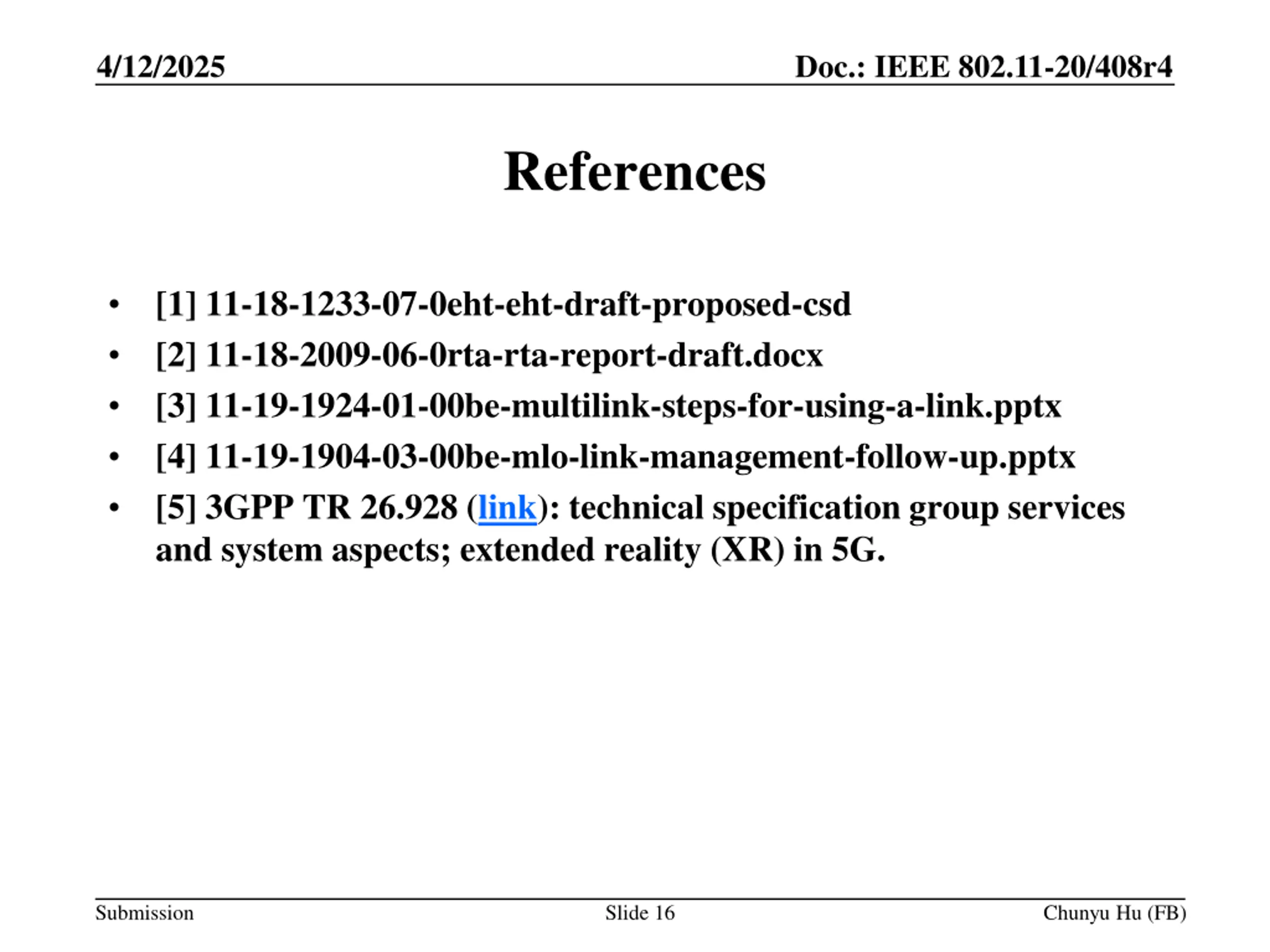 4/12/2025 Doc.: IEEE 802.11-20/408r4 References [1] 11-18-1233-07-0eht-eht-draft-proposed-csd [2] 11-18-2009-06-0rta-rta-report-draft.docx [3] 11-19-1924-01-00be-multilink-steps-for-using-a-link.pptx [4] 11-19-1904-03-00be-mlo-link-management-follow-up.pptx [5] 3GPP TR 26.928 (link): technical specification group services and system aspects; extended reality (XR) in 5G. Submission Slide 16 Chunyu Hu (FB)