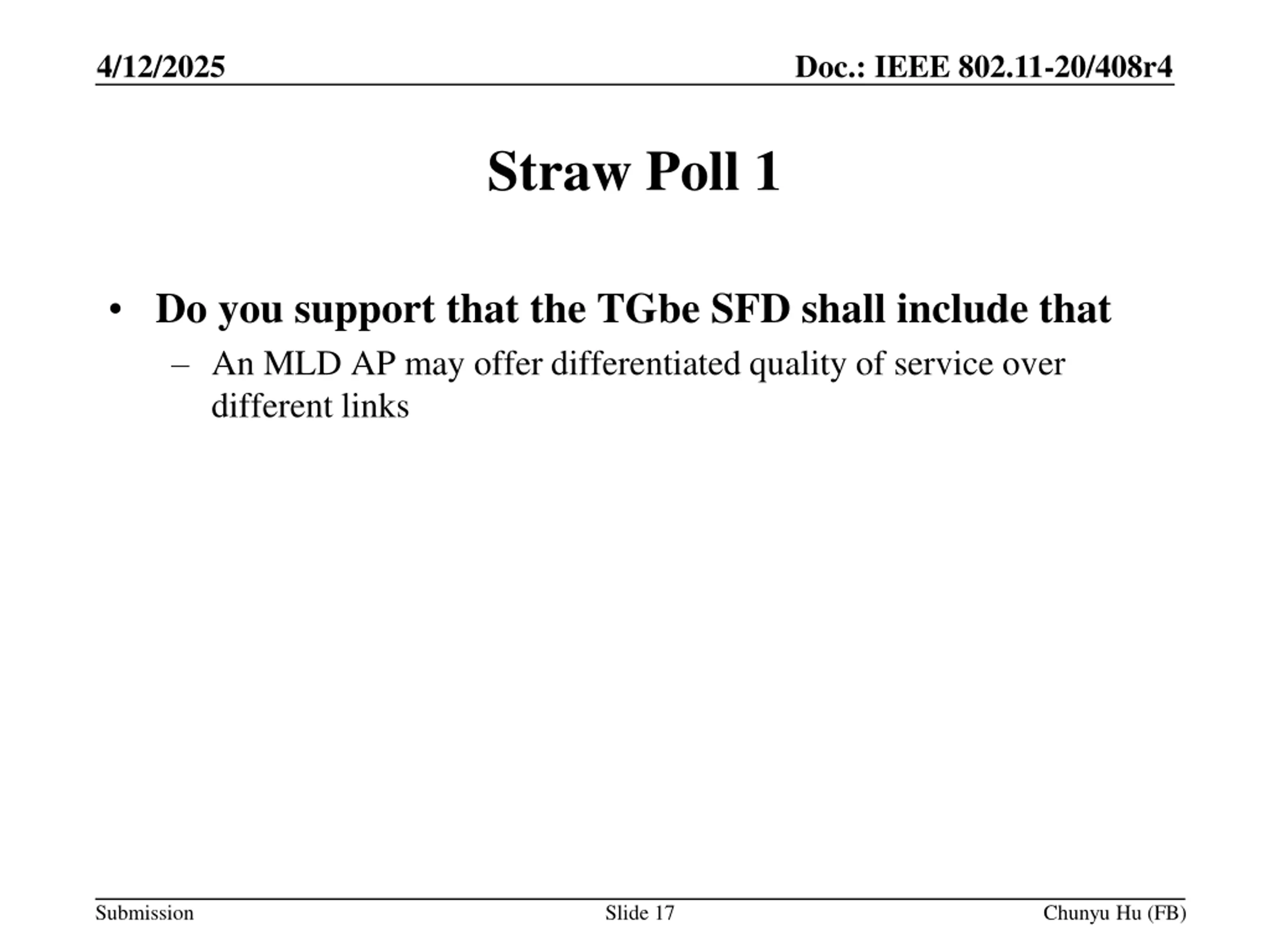 4/12/2025 Doc.: IEEE 802.11-20/408r4 Straw Poll 1 Do you support that the TGbe SFD shall include that An MLD AP may offer differentiated quality of service over different links Submission Slide 17 Chunyu Hu (FB)