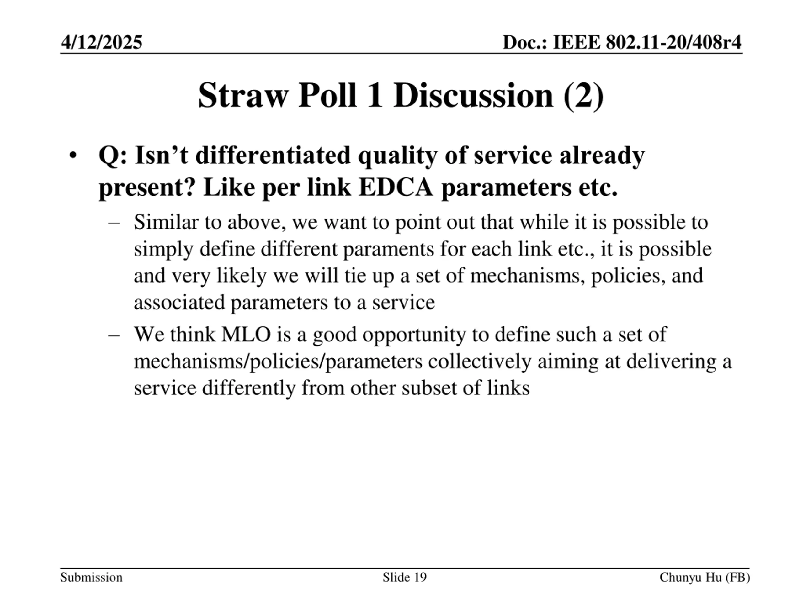 4/12/2025 Doc.: IEEE 802.11-20/408r4 Straw Poll 1 Discussion (1) Q: Is this service same as TID-to-link mapping? TID-to-link mapping is only part of enabling mechanism to achieve differentiated service over a subset of links Other components are likely needed as well, e.g., in case of latency sensitive application service, including some form or level (TBD) of admission control policy, and a prioritized EDCA access mechanism etc. Submission Slide 18 Chunyu Hu (FB)