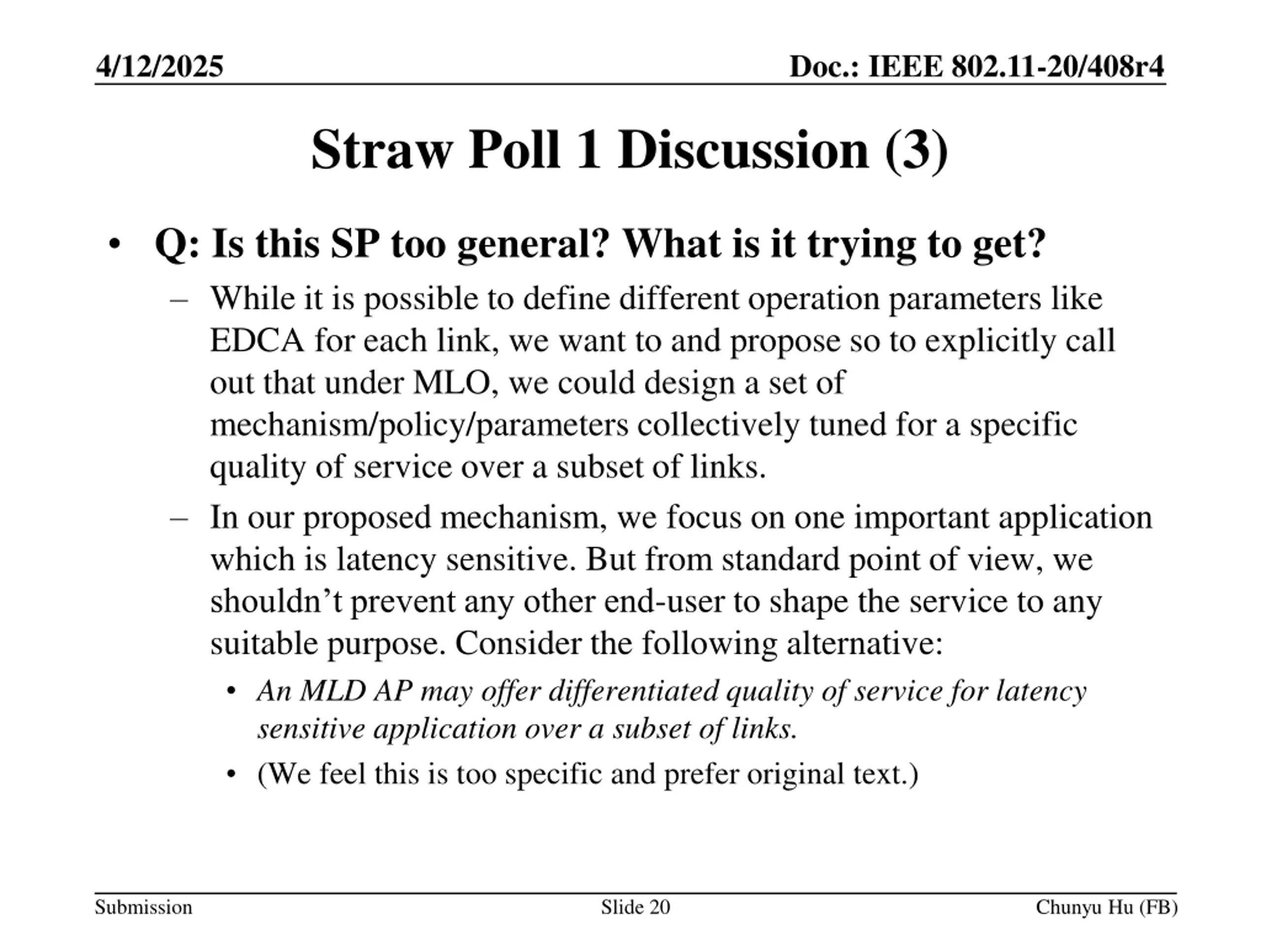 4/12/2025 Doc.: IEEE 802.11-20/408r4 Straw Poll 1 Discussion (2) Q: Isn t differentiated quality of service already present? Like per link EDCA parameters etc. Similar to above, we want to point out that while it is possible to simply define different paraments for each link etc., it is possible and very likely we will tie up a set of mechanisms, policies, and associated parameters to a service We think MLO is a good opportunity to define such a set of mechanisms/policies/parameters collectively aiming at delivering a service differently from other subset of links Submission Slide 19 Chunyu Hu (FB)