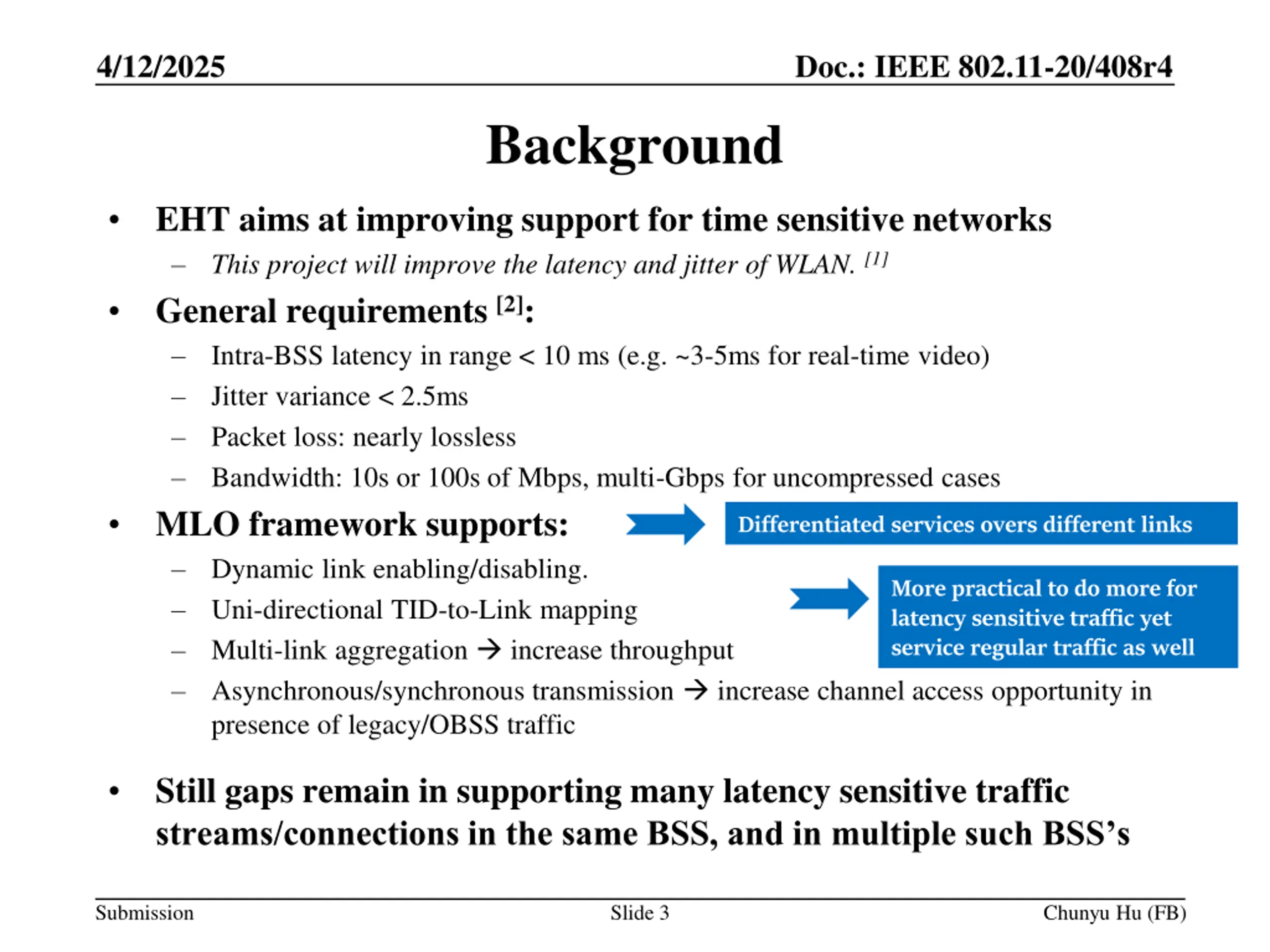 4/12/2025 Doc.: IEEE 802.11-20/408r4 Background EHT aims at improving support for time sensitive networks This project will improve the latency and jitter of WLAN. [1] General requirements [2]: Intra-BSS latency in range < 10 ms (e.g. ~3-5ms for real-time video) Jitter variance < 2.5ms Packet loss: nearly lossless Bandwidth: 10s or 100s of Mbps, multi-Gbps for uncompressed cases MLO framework supports: Dynamic link enabling/disabling. Uni-directional TID-to-Link mapping Multi-link aggregation increase throughput Asynchronous/synchronous transmission increase channel access opportunity in presence of legacy/OBSS traffic Differentiated services overs different links More practical to do more for latency sensitive traffic yet service regular traffic as well Still gaps remain in supporting many latency sensitive traffic streams/connections in the same BSS, and in multiple such BSS s Submission Slide 3 Chunyu Hu (FB)