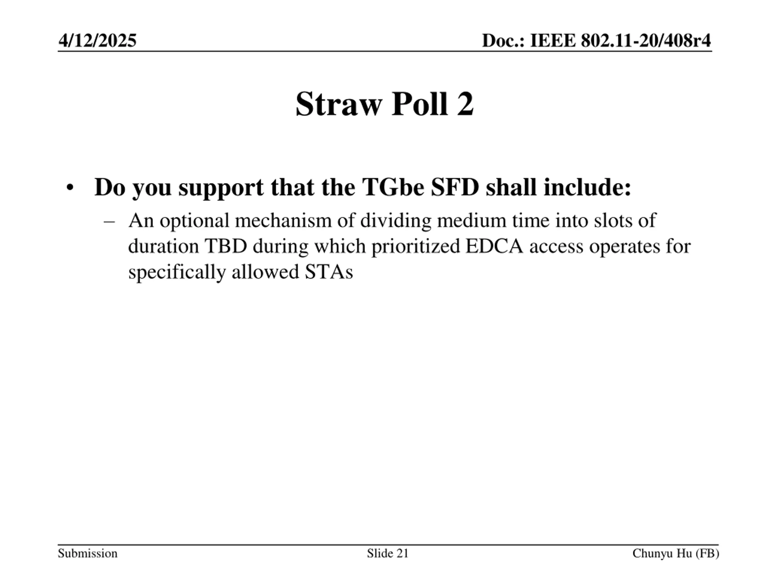 4/12/2025 Doc.: IEEE 802.11-20/408r4 Straw Poll 2 Do you support that the TGbe SFD shall include: An optional mechanism of dividing medium time into slots of duration TBD during which prioritized EDCA access operates for specifically allowed STAs Submission Slide 21 Chunyu Hu (FB)