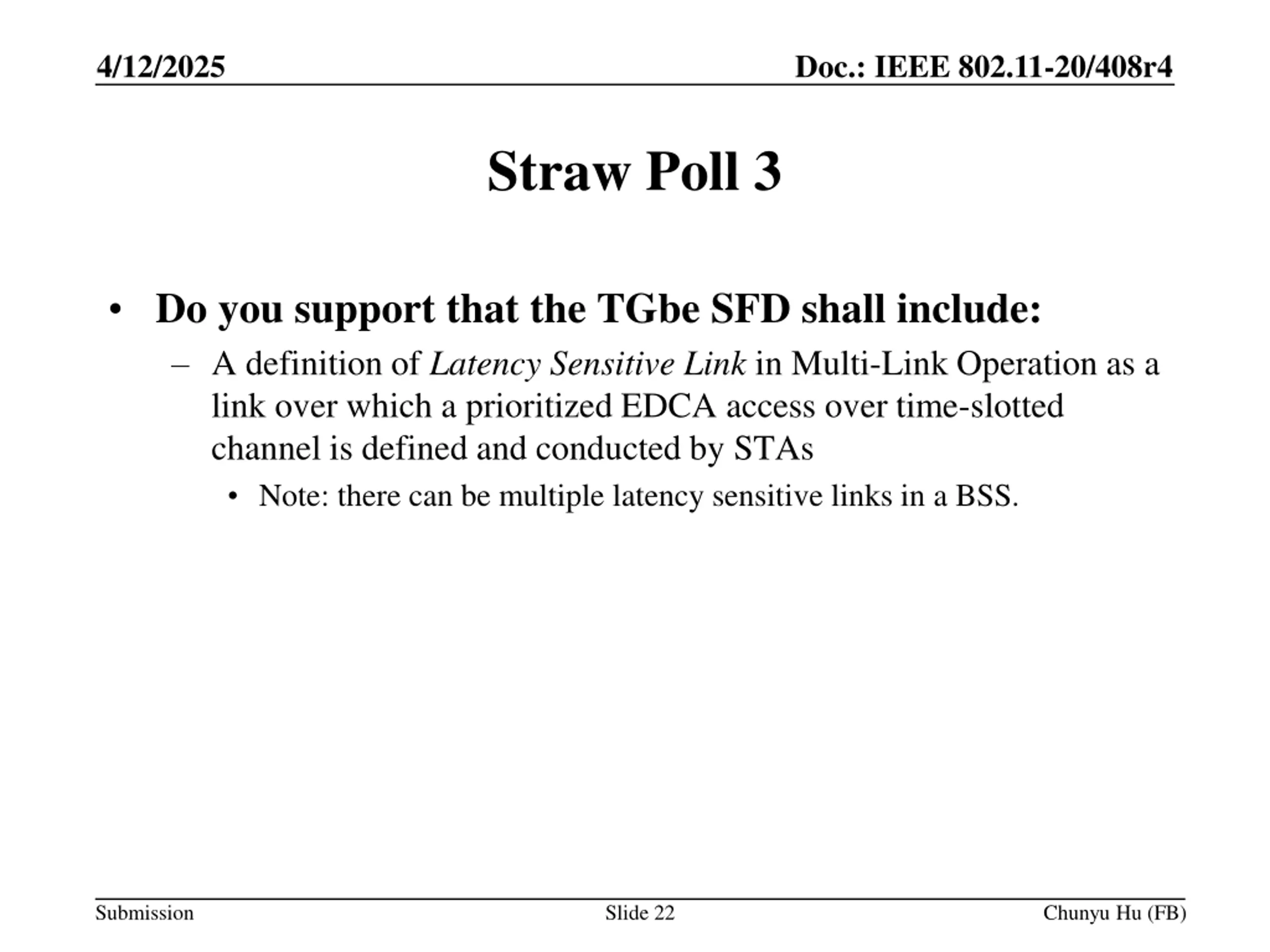 4/12/2025 Doc.: IEEE 802.11-20/408r4 Straw Poll 3 Do you support that the TGbe SFD shall include: A definition of Latency Sensitive Link in Multi-Link Operation as a link over which a prioritized EDCA access over time-slotted channel is defined and conducted by STAs Note: there can be multiple latency sensitive links in a BSS. Submission Slide 22 Chunyu Hu (FB)