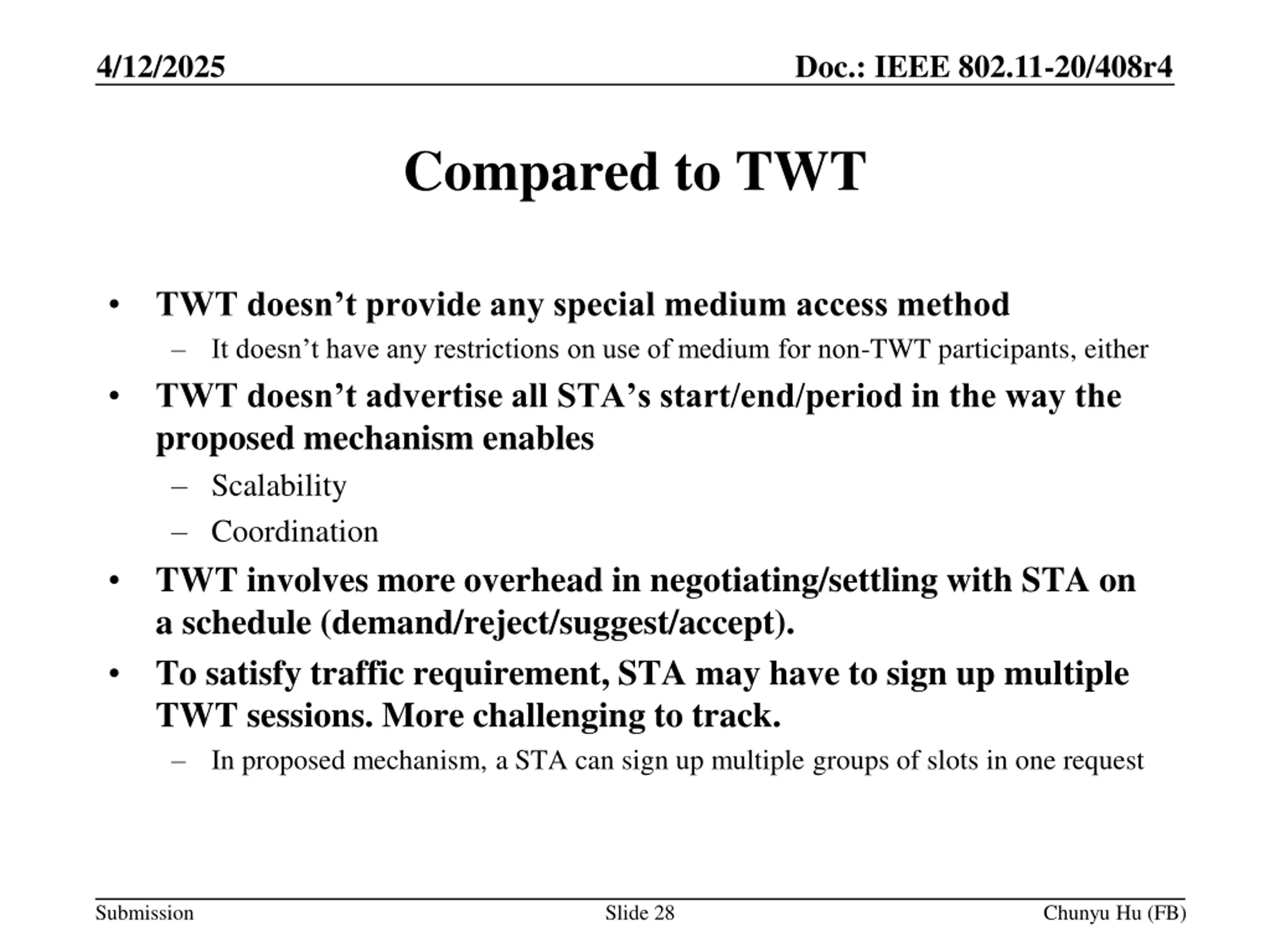 4/12/2025 Doc.: IEEE 802.11-20/408r4 Compared to TWT TWT doesn t provide any special medium access method It doesn t have any restrictions on use of medium for non-TWT participants, either TWT doesn t advertise all STA s start/end/period in the way the proposed mechanism enables Scalability Coordination TWT involves more overhead in negotiating/settling with STA on a schedule (demand/reject/suggest/accept). To satisfy traffic requirement, STA may have to sign up multiple TWT sessions. More challenging to track. In proposed mechanism, a STA can sign up multiple groups of slots in one request Submission Slide 28 Chunyu Hu (FB)