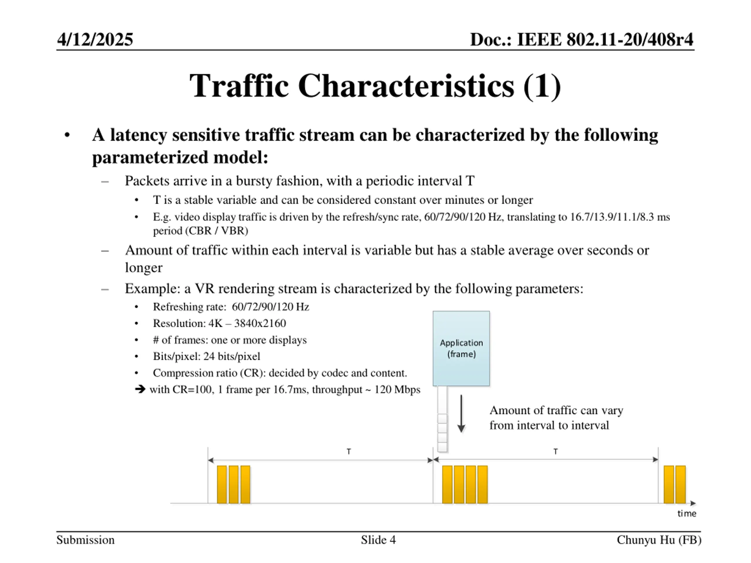 4/12/2025 Doc.: IEEE 802.11-20/408r4 Traffic Characteristics (1) A latency sensitive traffic stream can be characterized by the following parameterized model: Packets arrive in a bursty fashion, with a periodic interval T T is a stable variable and can be considered constant over minutes or longer E.g. video display traffic is driven by the refresh/sync rate, 60/72/90/120 Hz, translating to 16.7/13.9/11.1/8.3 ms period (CBR / VBR) Amount of traffic within each interval is variable but has a stable average over seconds or longer Example: a VR rendering stream is characterized by the following parameters: Refreshing rate: 60/72/90/120 Hz Resolution: 4K 3840x2160 # of frames: one or more displays Bits/pixel: 24 bits/pixel Compression ratio (CR): decided by codec and content. with CR=100, 1 frame per 16.7ms, throughput ~ 120 Mbps Application (frame) Amount of traffic can vary from interval to interval T T time Submission Slide 4 Chunyu Hu (FB)