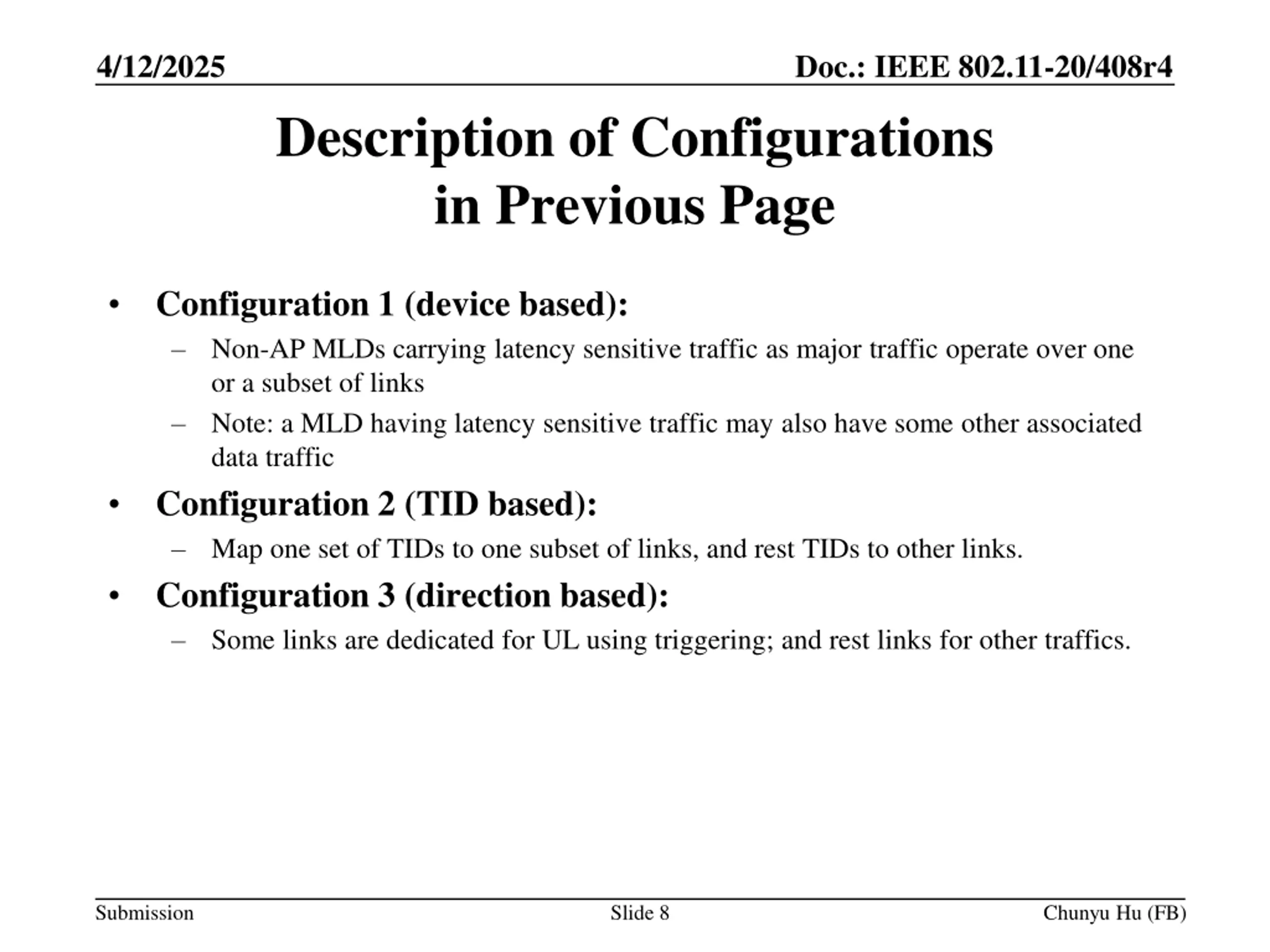 4/12/2025 Doc.: IEEE 802.11-20/408r4 Description of Configurations in Previous Page Configuration 1 (device based): Non-AP MLDs carrying latency sensitive traffic as major traffic operate over one or a subset of links Note: a MLD having latency sensitive traffic may also have some other associated data traffic Configuration 2 (TID based): Map one set of TIDs to one subset of links, and rest TIDs to other links. Configuration 3 (direction based): Some links are dedicated for UL using triggering; and rest links for other traffics. Submission Slide 8 Chunyu Hu (FB)