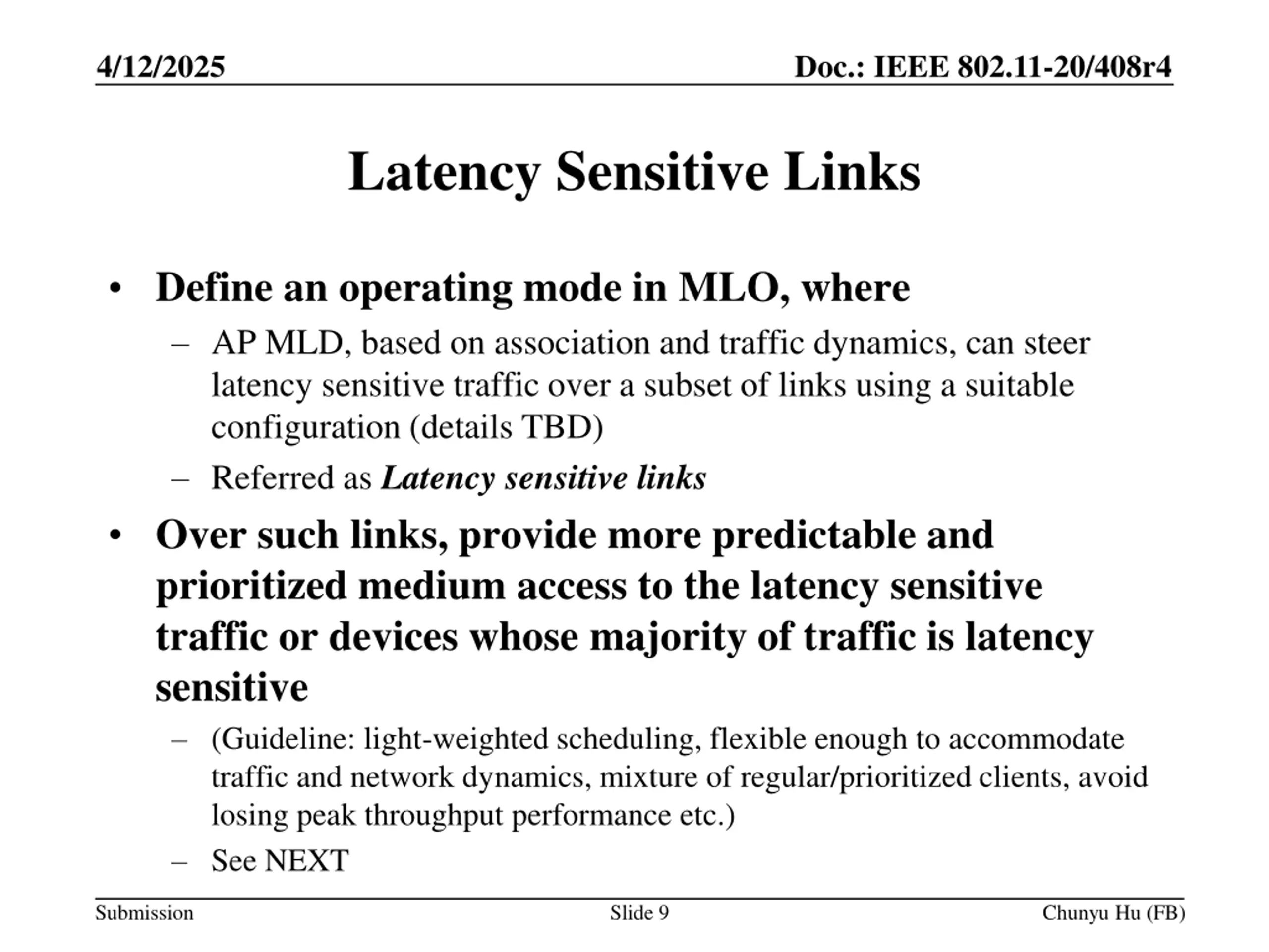 4/12/2025 Doc.: IEEE 802.11-20/408r4 Latency Sensitive Links Define an operating mode in MLO, where AP MLD, based on association and traffic dynamics, can steer latency sensitive traffic over a subset of links using a suitable configuration (details TBD) Referred as Latency sensitive links Over such links, provide more predictable and prioritized medium access to the latency sensitive traffic or devices whose majority of traffic is latency sensitive (Guideline: light-weighted scheduling, flexible enough to accommodate traffic and network dynamics, mixture of regular/prioritized clients, avoid losing peak throughput performance etc.) See NEXT Submission Slide 9 Chunyu Hu (FB)