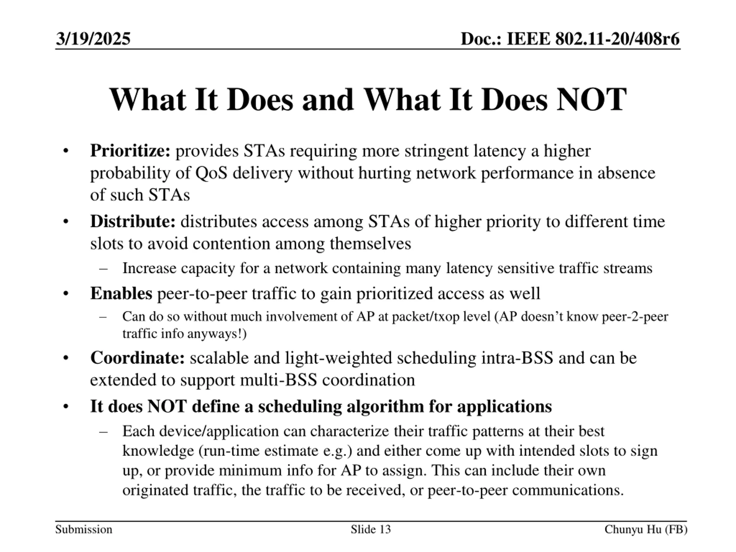 3/19/2025 Doc.: IEEE 802.11-20/408r6 What It Does and What It Does NOT Prioritize: provides STAs requiring more stringent latency a higher probability of QoS delivery without hurting network performance in absence of such STAs Distribute: distributes access among STAs of higher priority to different time slots to avoid contention among themselves Increase capacity for a network containing many latency sensitive traffic streams Enables peer-to-peer traffic to gain prioritized access as well Can do so without much involvement of AP at packet/txop level (AP doesn t know peer-2-peer traffic info anyways!) Coordinate: scalable and light-weighted scheduling intra-BSS and can be extended to support multi-BSS coordination It does NOT define a scheduling algorithm for applications Each device/application can characterize their traffic patterns at their best knowledge (run-time estimate e.g.) and either come up with intended slots to sign up, or provide minimum info for AP to assign. This can include their own originated traffic, the traffic to be received, or peer-to-peer communications. Submission Slide 13 Chunyu Hu (FB)