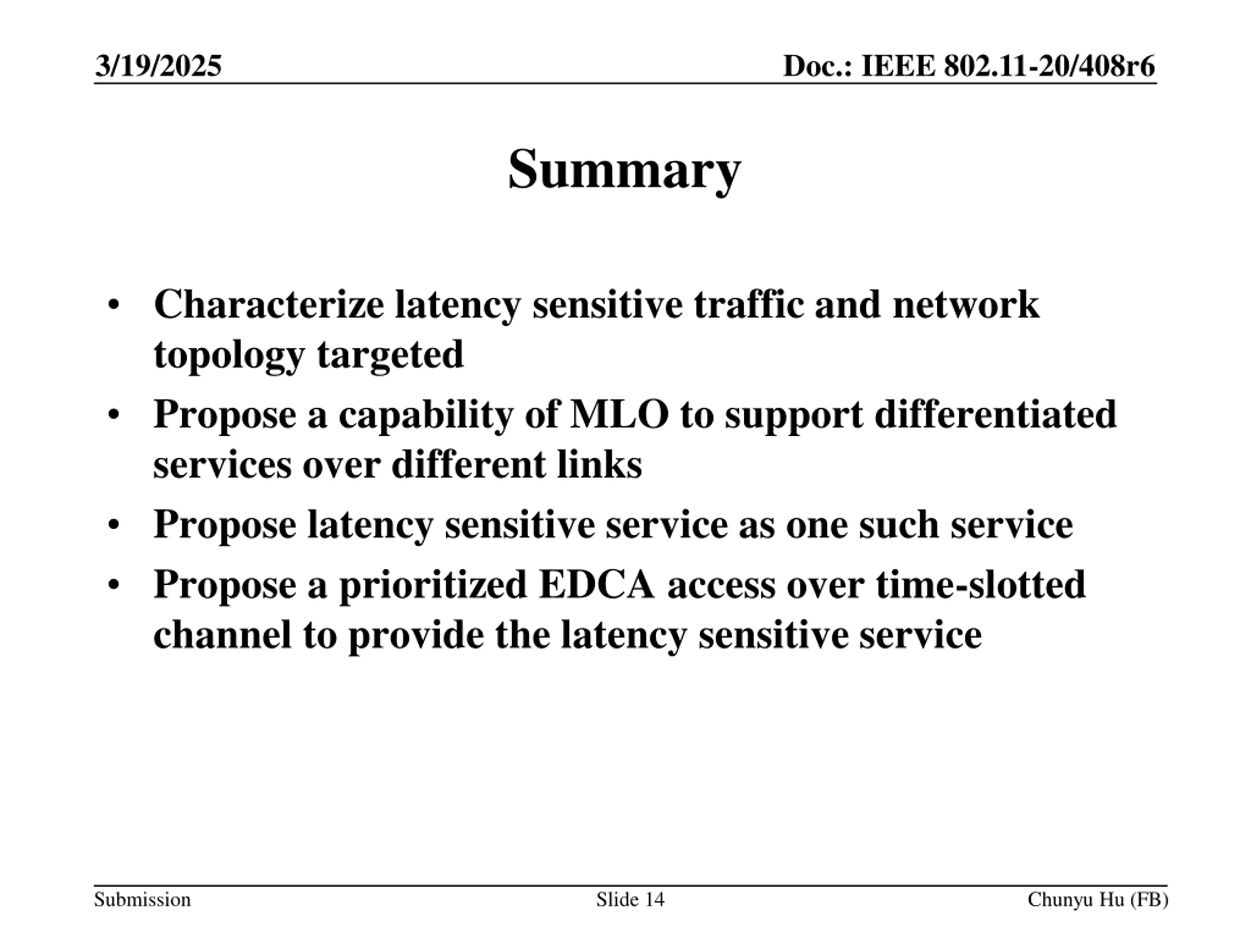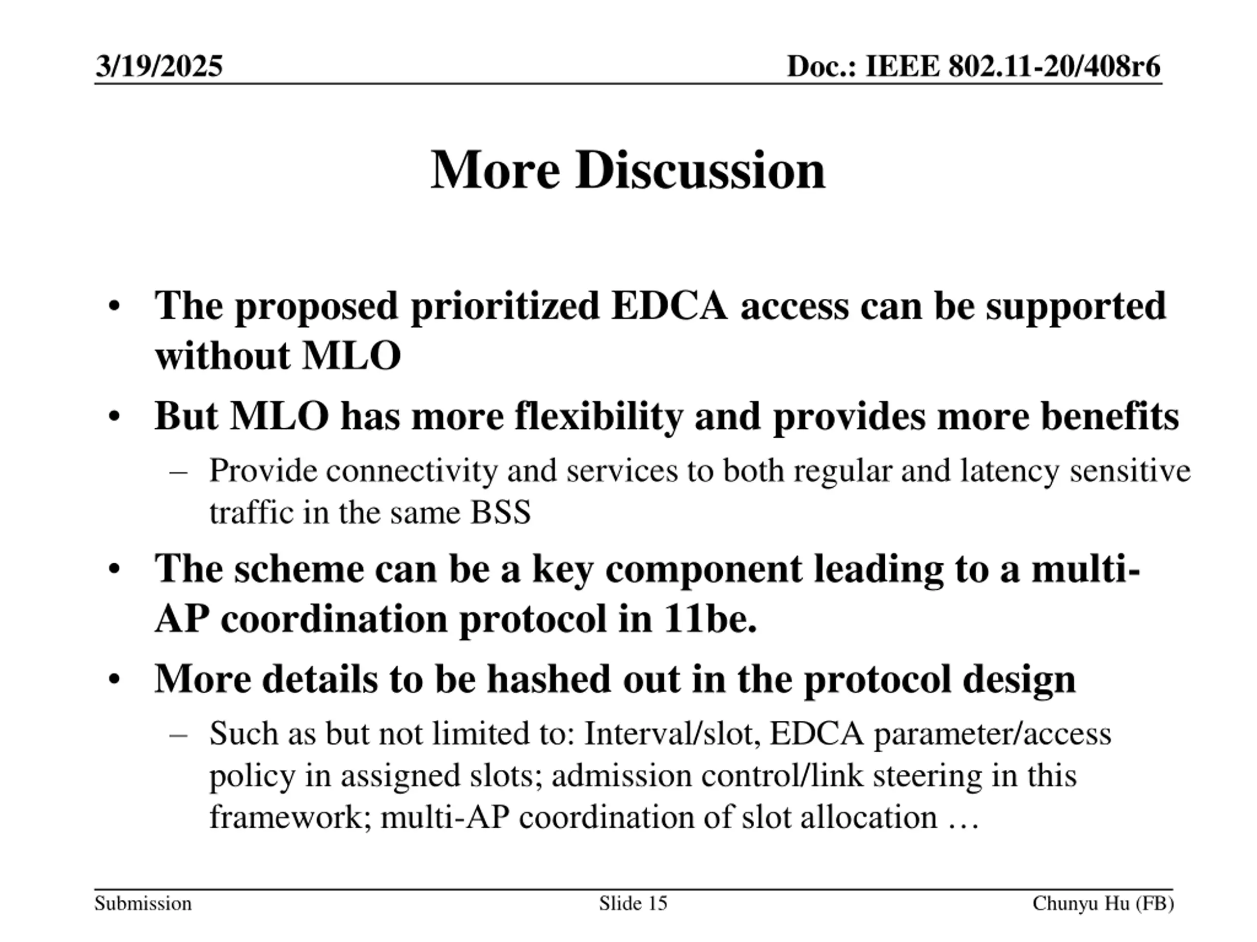3/19/2025 Doc.: IEEE 802.11-20/408r6 Summary Characterize latency sensitive traffic and network topology targeted Propose a capability of MLO to support differentiated services over different links Propose latency sensitive service as one such service Propose a prioritized EDCA access over time-slotted channel to provide the latency sensitive service Submission Slide 14 Chunyu Hu (FB)