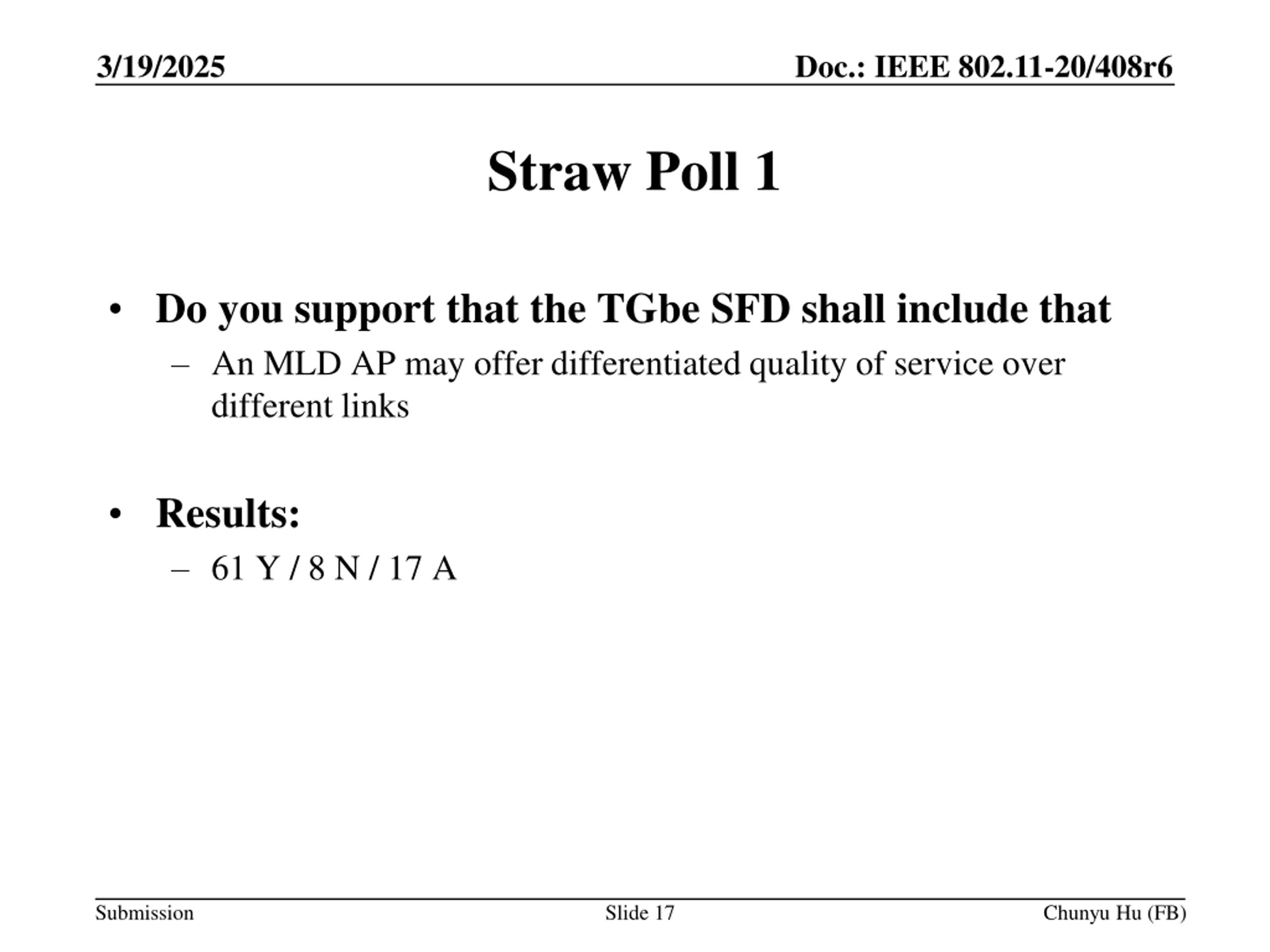 3/19/2025 Doc.: IEEE 802.11-20/408r6 Straw Poll 1 Do you support that the TGbe SFD shall include that An MLD AP may offer differentiated quality of service over different links Results: 61 Y / 8 N / 17 A Submission Slide 17 Chunyu Hu (FB)