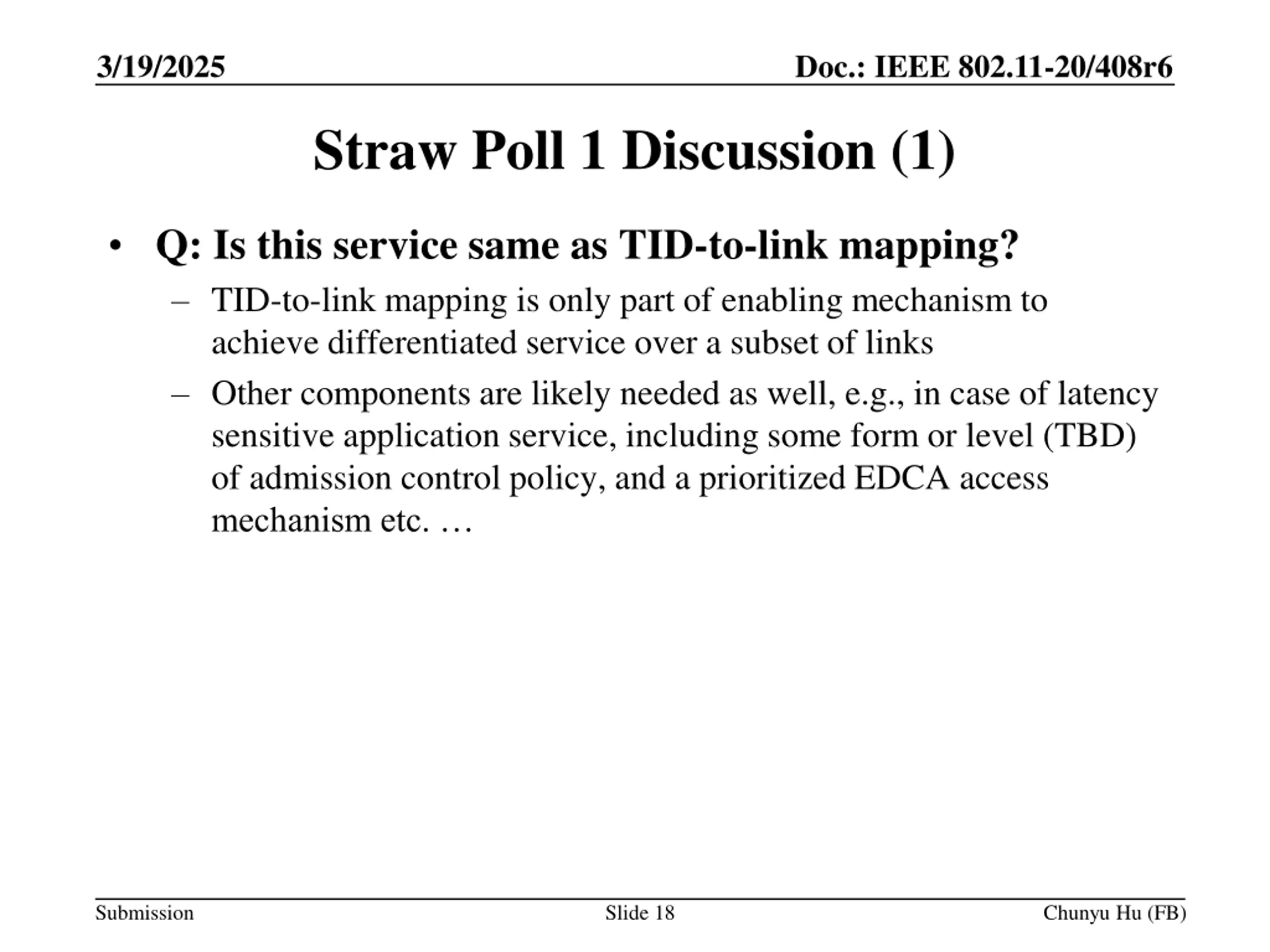 3/19/2025 Doc.: IEEE 802.11-20/408r6 Straw Poll 1 Discussion (1) Q: Is this service same as TID-to-link mapping? TID-to-link mapping is only part of enabling mechanism to achieve differentiated service over a subset of links Other components are likely needed as well, e.g., in case of latency sensitive application service, including some form or level (TBD) of admission control policy, and a prioritized EDCA access mechanism etc. Submission Slide 18 Chunyu Hu (FB)