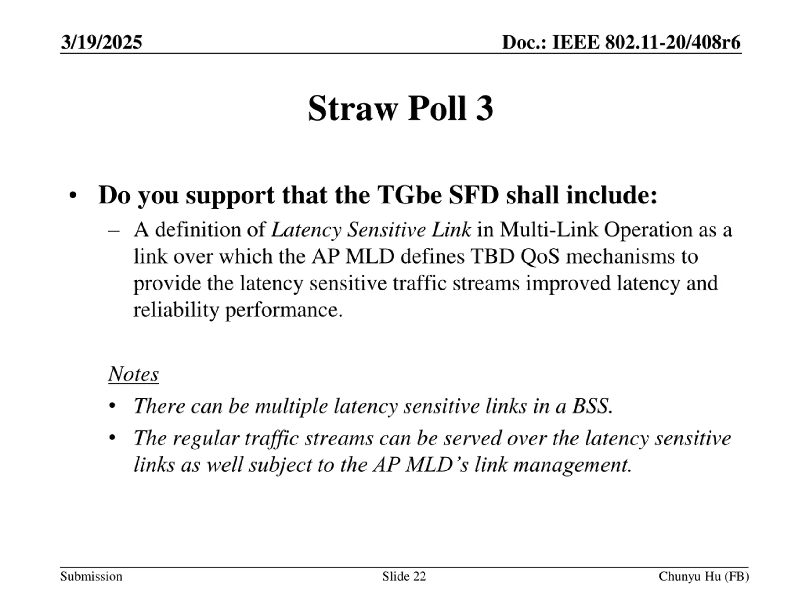 3/19/2025 Doc.: IEEE 802.11-20/408r6 Straw Poll 3 Do you support that the TGbe SFD shall include: A definition of Latency Sensitive Link in Multi-Link Operation as a link over which the AP MLD defines TBD QoS mechanisms to provide the latency sensitive traffic streams improved latency and reliability performance. Notes There can be multiple latency sensitive links in a BSS. The regular traffic streams can be served over the latency sensitive links as well subject to the AP MLD s link management. Submission Slide 22 Chunyu Hu (FB)
