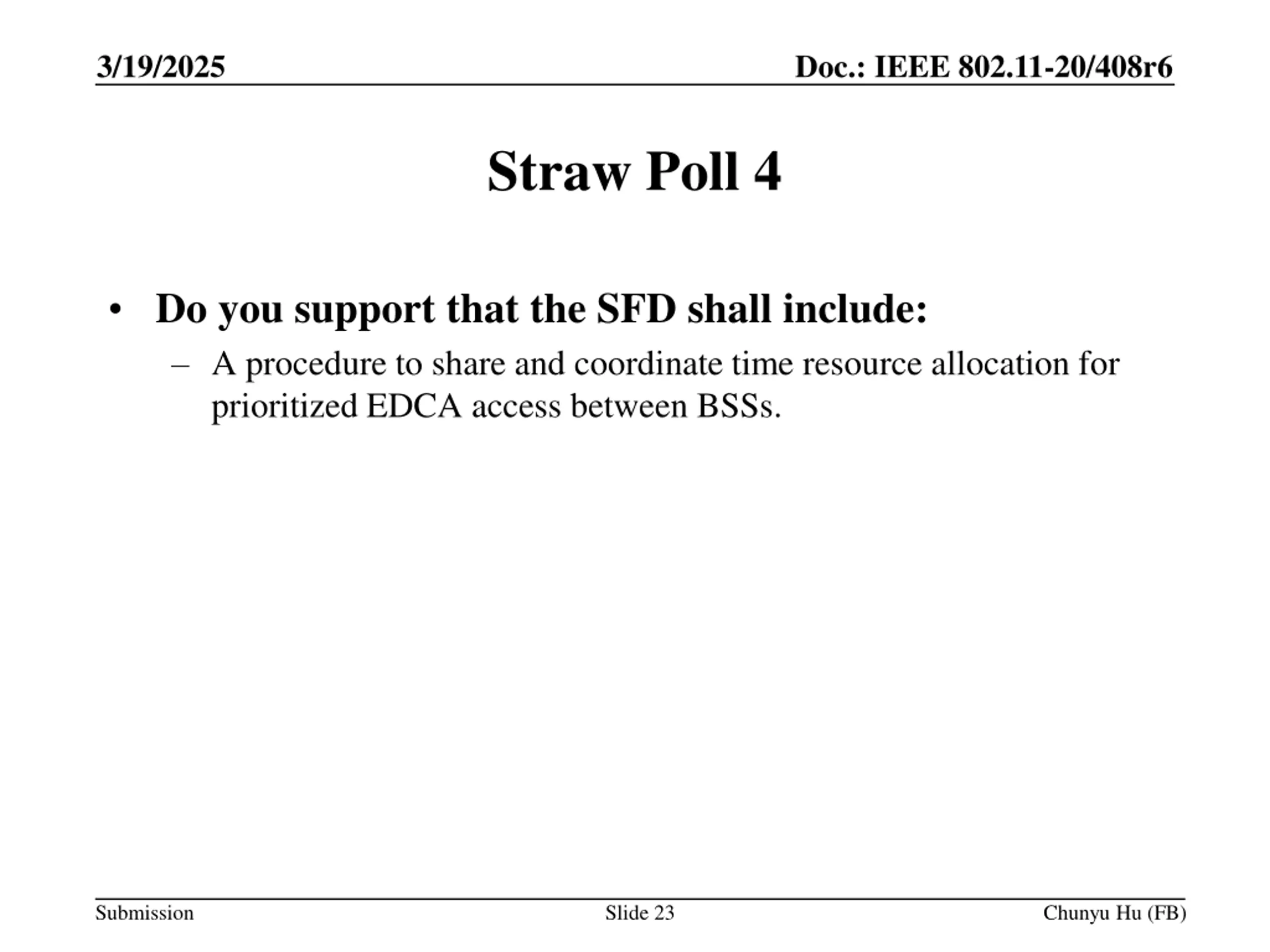 3/19/2025 Doc.: IEEE 802.11-20/408r6 Straw Poll 4 Do you support that the SFD shall include: A procedure to share and coordinate time resource allocation for prioritized EDCA access between BSSs. Submission Slide 23 Chunyu Hu (FB)