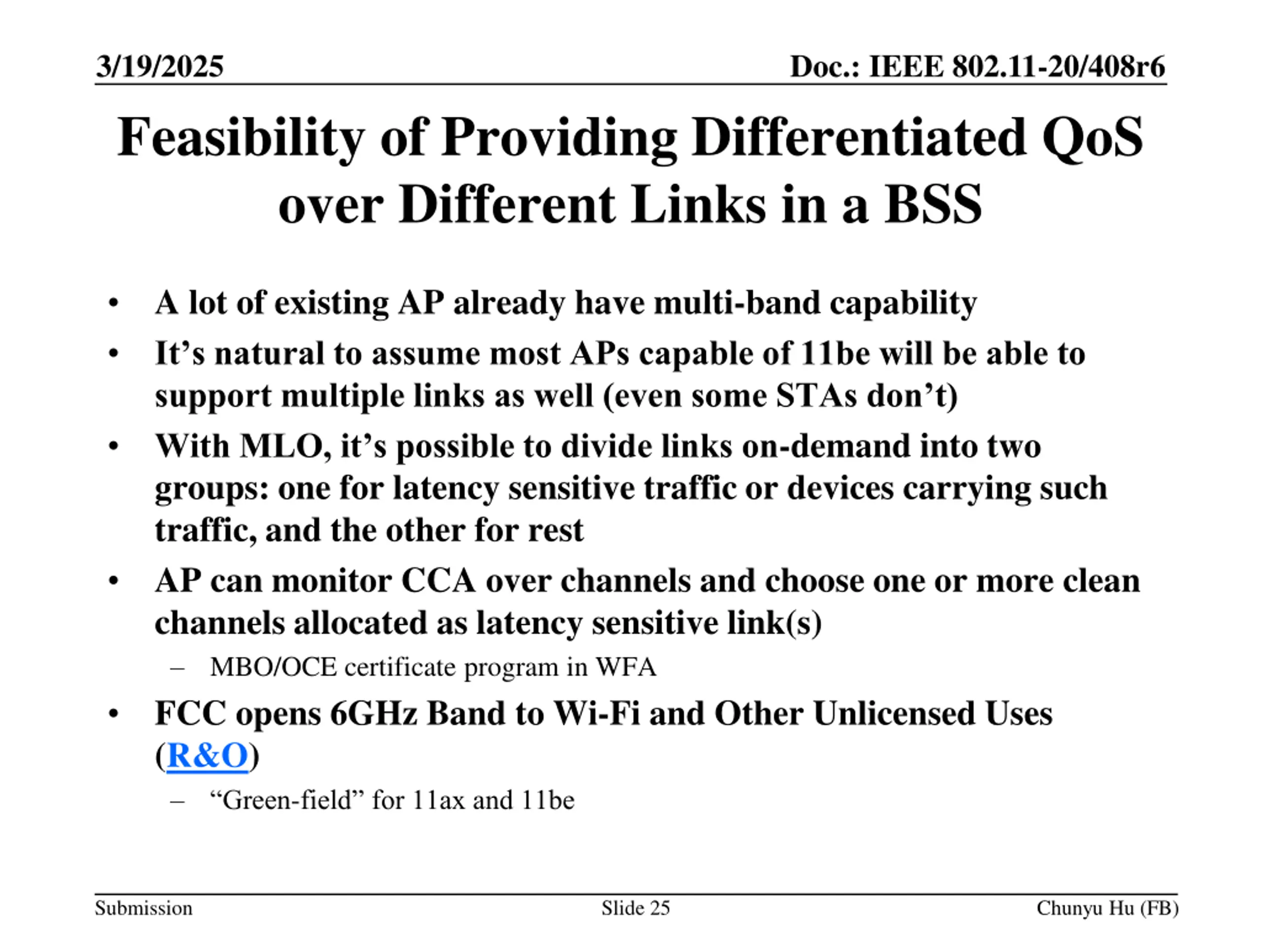 3/19/2025 Doc.: IEEE 802.11-20/408r6 Feasibility of Providing Differentiated QoS over Different Links in a BSS A lot of existing AP already have multi-band capability It s natural to assume most APs capable of 11be will be able to support multiple links as well (even some STAs don t) With MLO, it s possible to divide links on-demand into two groups: one for latency sensitive traffic or devices carrying such traffic, and the other for rest AP can monitor CCA over channels and choose one or more clean channels allocated as latency sensitive link(s) MBO/OCE certificate program in WFA FCC opens 6GHz Band to Wi-Fi and Other Unlicensed Uses (R&O) Green-field for 11ax and 11be Submission Slide 25 Chunyu Hu (FB)