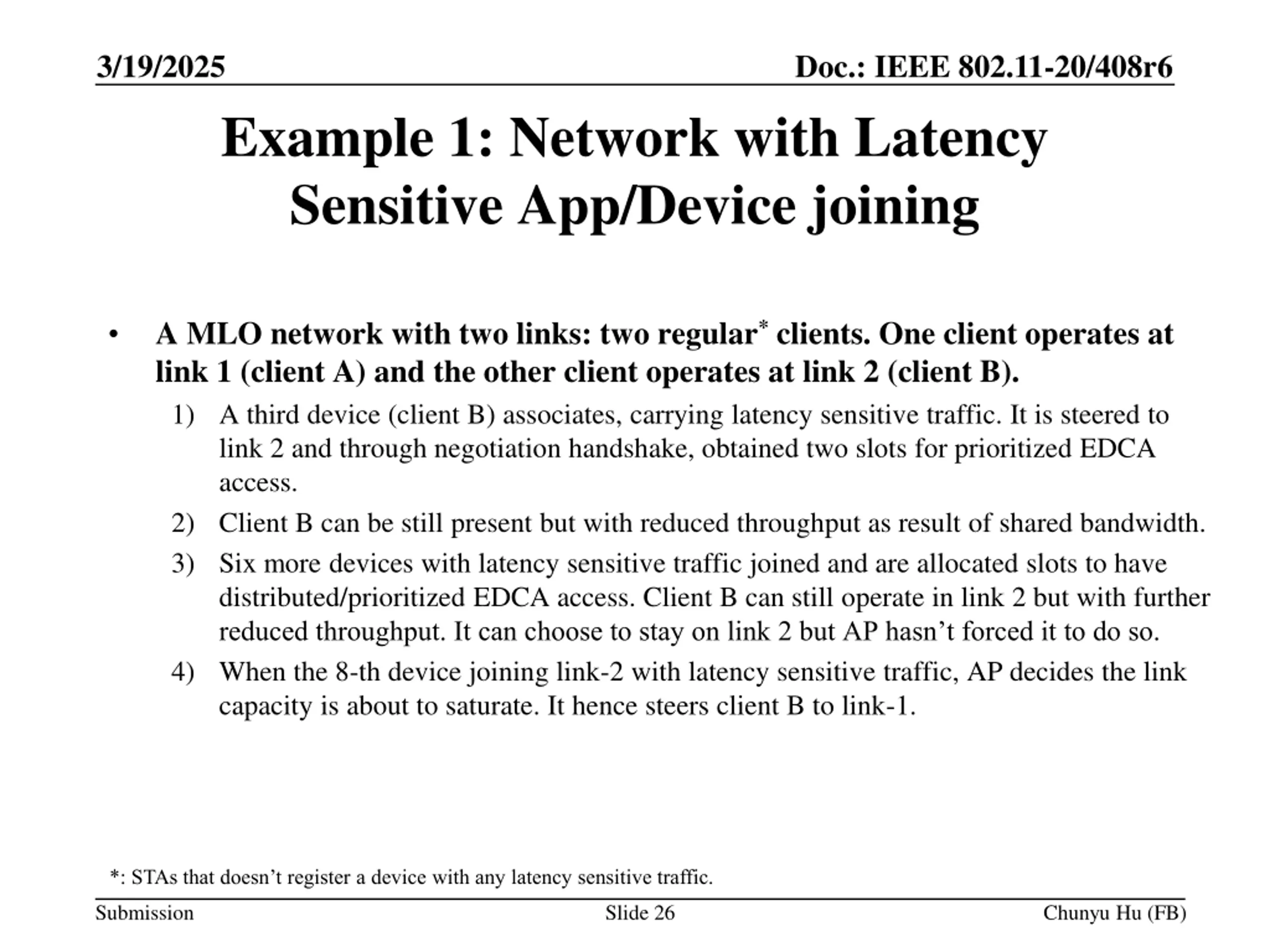 3/19/2025 Doc.: IEEE 802.11-20/408r6 Example 1: Network with Latency Sensitive App/Device joining A MLO network with two links: two regular* clients. One client operates at link 1 (client A) and the other client operates at link 2 (client B). 1) A third device (client B) associates, carrying latency sensitive traffic. It is steered to link 2 and through negotiation handshake, obtained two slots for prioritized EDCA access. 2) Client B can be still present but with reduced throughput as result of shared bandwidth. 3) Six more devices with latency sensitive traffic joined and are allocated slots to have distributed/prioritized EDCA access. Client B can still operate in link 2 but with further reduced throughput. It can choose to stay on link 2 but AP hasn t forced it to do so. 4) When the 8-th device joining link-2 with latency sensitive traffic, AP decides the link capacity is about to saturate. It hence steers client B to link-1. *: STAs that doesn t register a device with any latency sensitive traffic. Submission Slide 26 Chunyu Hu (FB)