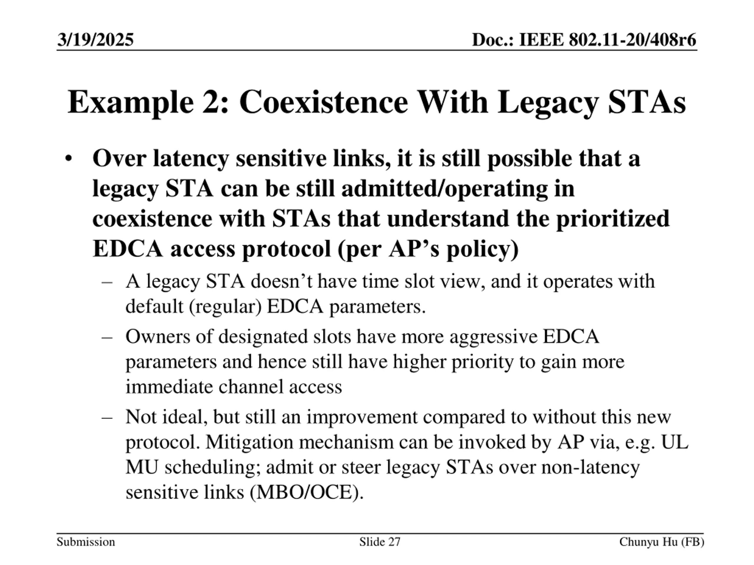 3/19/2025 Doc.: IEEE 802.11-20/408r6 Example 2: Coexistence With Legacy STAs Over latency sensitive links, it is still possible that a legacy STA can be still admitted/operating in coexistence with STAs that understand the prioritized EDCA access protocol (per AP s policy) A legacy STA doesn t have time slot view, and it operates with default (regular) EDCA parameters. Owners of designated slots have more aggressive EDCA parameters and hence still have higher priority to gain more immediate channel access Not ideal, but still an improvement compared to without this new protocol. Mitigation mechanism can be invoked by AP via, e.g. UL MU scheduling; admit or steer legacy STAs over non-latency sensitive links (MBO/OCE). Submission Slide 27 Chunyu Hu (FB)