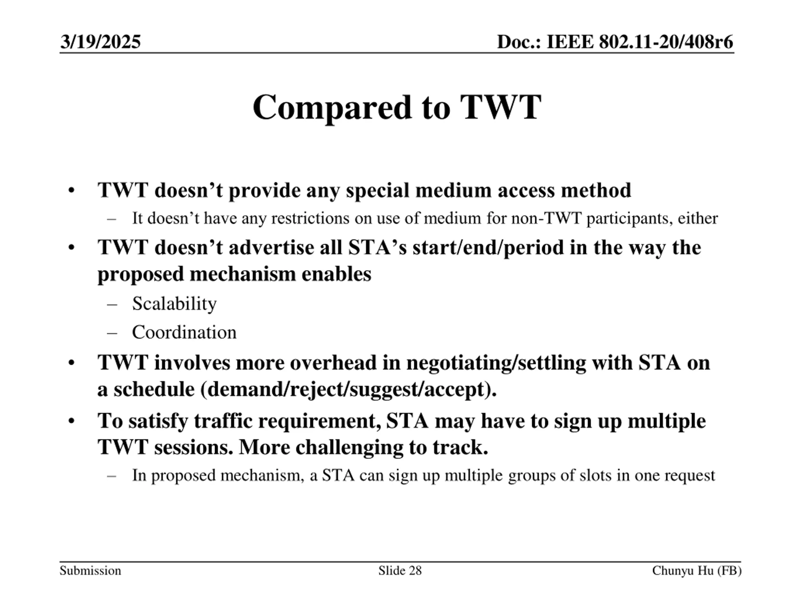 3/19/2025 Doc.: IEEE 802.11-20/408r6 Compared to TWT TWT doesn t provide any special medium access method It doesn t have any restrictions on use of medium for non-TWT participants, either TWT doesn t advertise all STA s start/end/period in the way the proposed mechanism enables Scalability Coordination TWT involves more overhead in negotiating/settling with STA on a schedule (demand/reject/suggest/accept). To satisfy traffic requirement, STA may have to sign up multiple TWT sessions. More challenging to track. In proposed mechanism, a STA can sign up multiple groups of slots in one request Submission Slide 28 Chunyu Hu (FB)