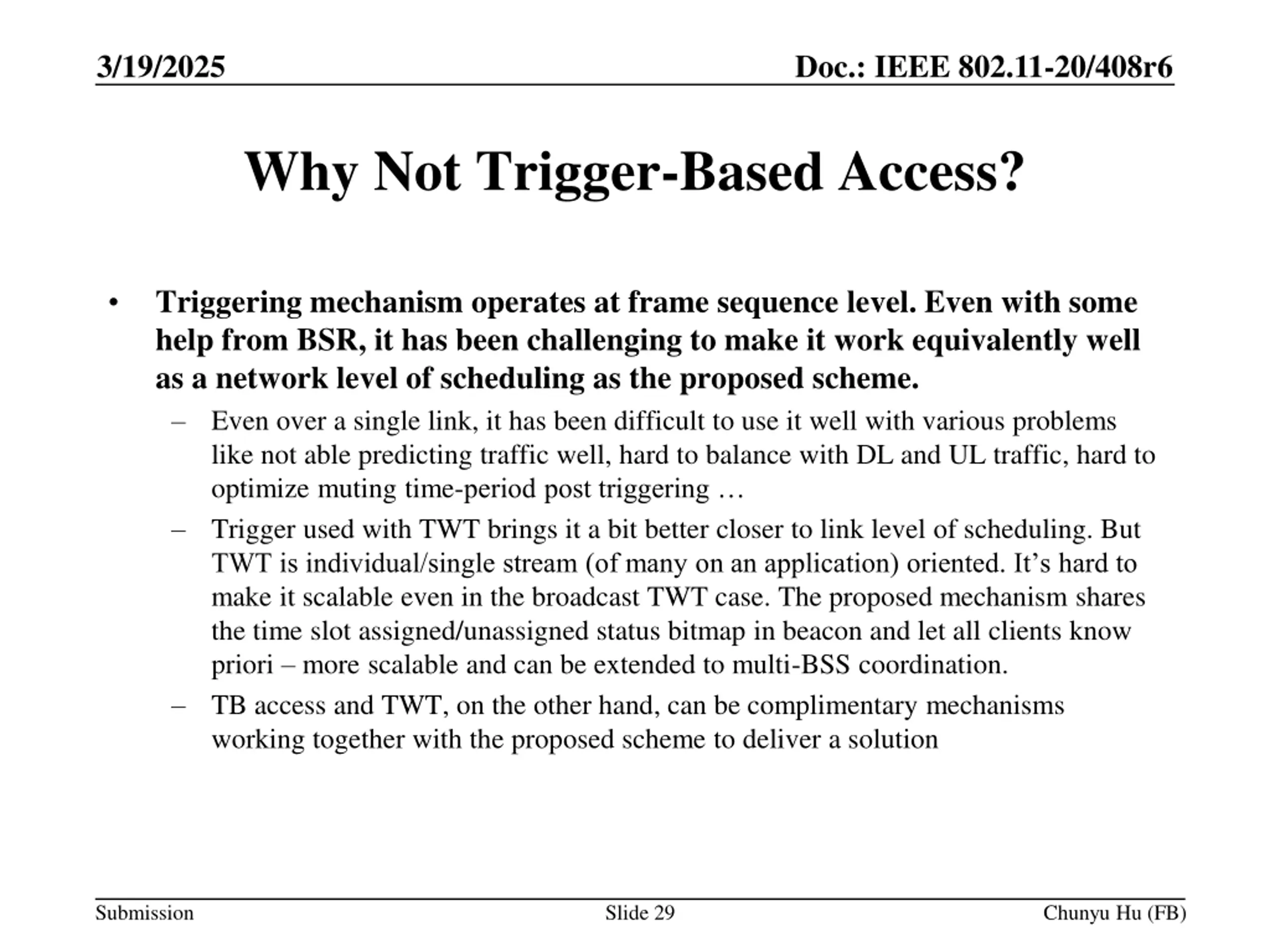 3/19/2025 Doc.: IEEE 802.11-20/408r6 Why Not Trigger-Based Access? Triggering mechanism operates at frame sequence level. Even with some help from BSR, it has been challenging to make it work equivalently well as a network level of scheduling as the proposed scheme. Even over a single link, it has been difficult to use it well with various problems like not able predicting traffic well, hard to balance with DL and UL traffic, hard to optimize muting time-period post triggering Trigger used with TWT brings it a bit better closer to link level of scheduling. But TWT is individual/single stream (of many on an application) oriented. It s hard to make it scalable even in the broadcast TWT case. The proposed mechanism shares the time slot assigned/unassigned status bitmap in beacon and let all clients know priori more scalable and can be extended to multi-BSS coordination. TB access and TWT, on the other hand, can be complimentary mechanisms working together with the proposed scheme to deliver a solution Submission Slide 29 Chunyu Hu (FB)
