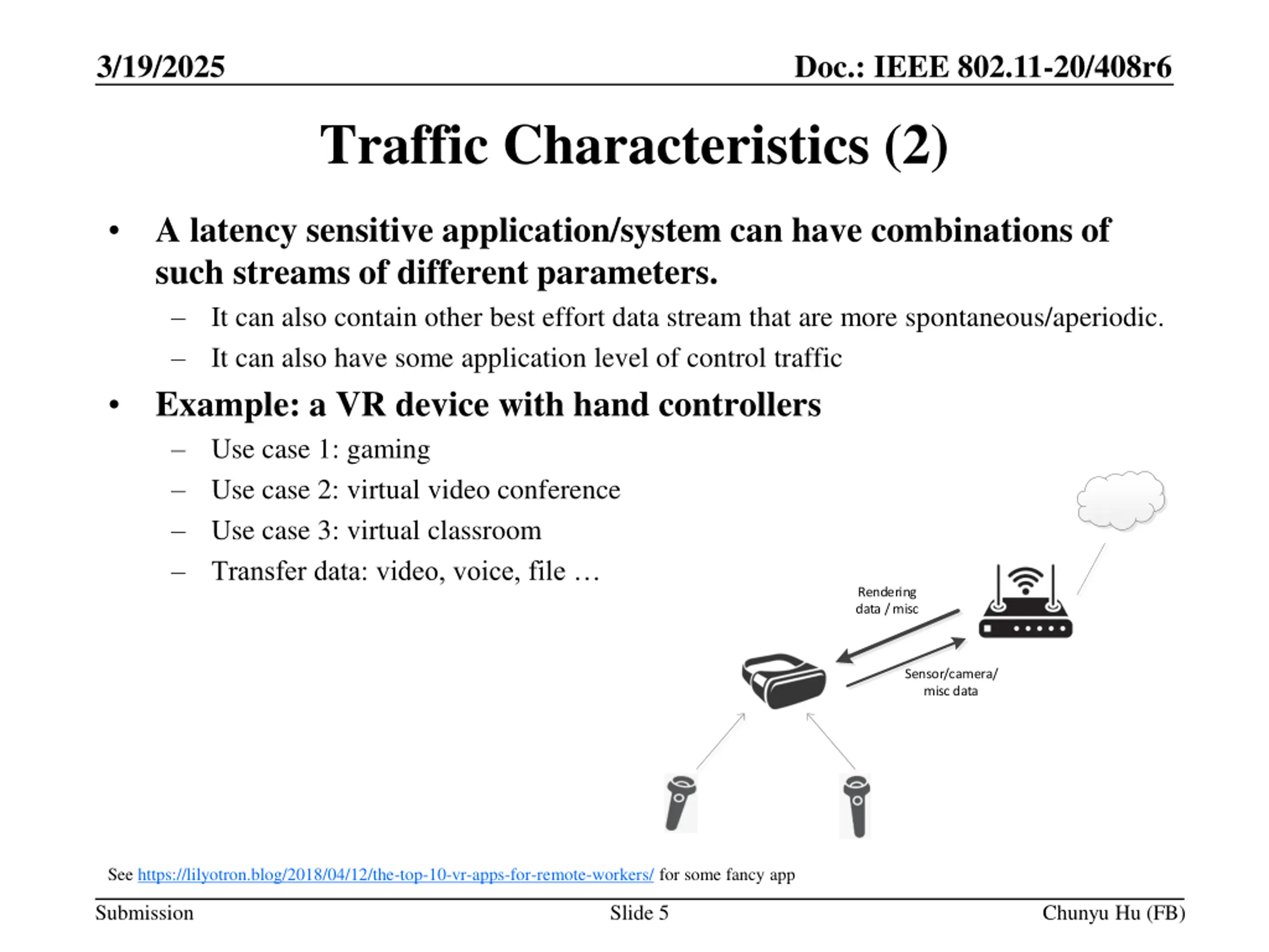 3/19/2025 Doc.: IEEE 802.11-20/408r6 Traffic Characteristics (2) A latency sensitive application/system can have combinations of such streams of different parameters. It can also contain other best effort data stream that are more spontaneous/aperiodic. It can also have some application level of control traffic Example: a VR device with hand controllers Use case 1: gaming Use case 2: virtual video conference Use case 3: virtual classroom Transfer data: video, voice, file Rendering data / misc Sensor/camera/ misc data See https://lilyotron.blog/2018/04/12/the-top-10-vr-apps-for-remote-workers/ for some fancy app Submission Slide 5 Chunyu Hu (FB)