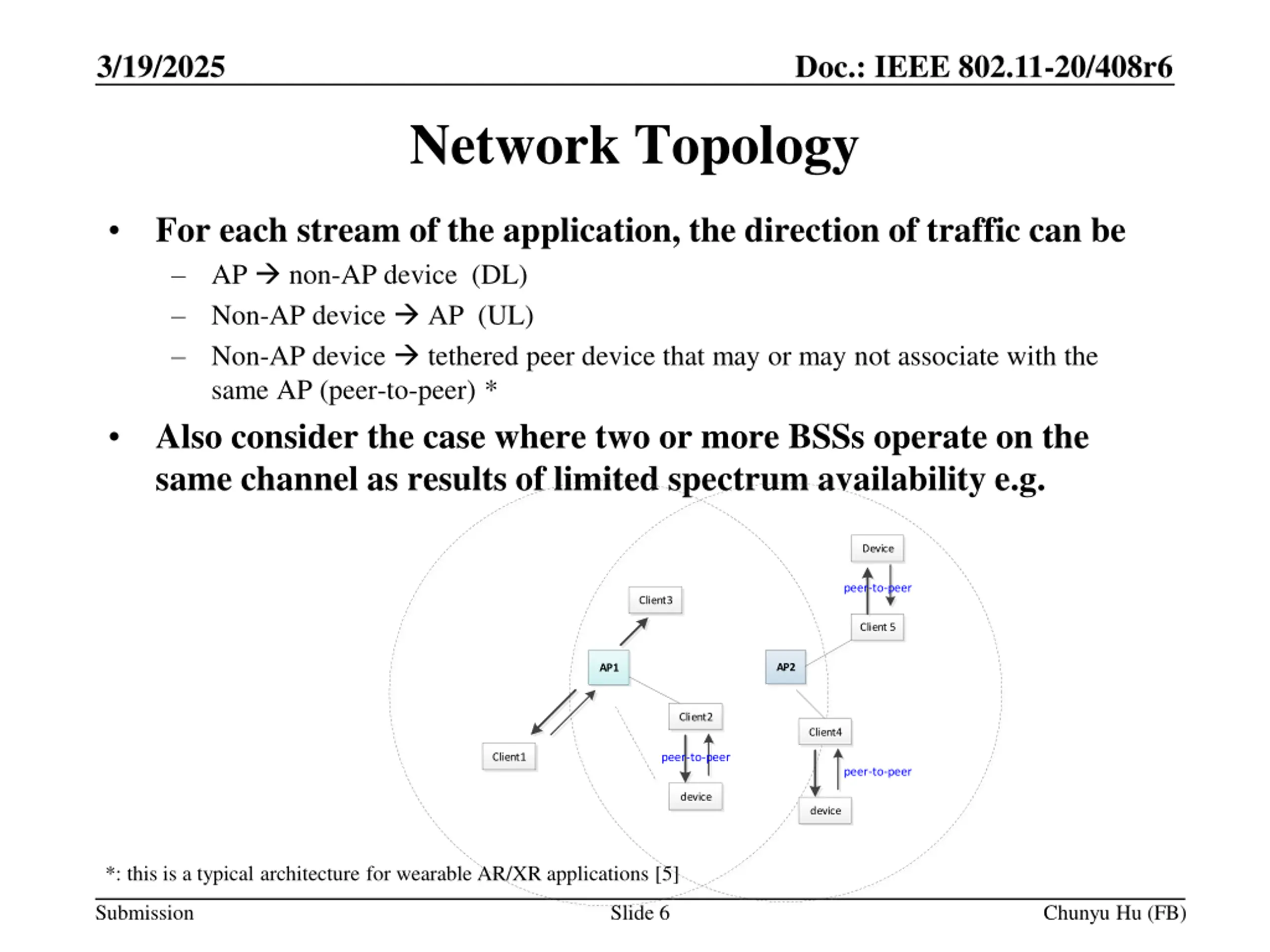3/19/2025 Doc.: IEEE 802.11-20/408r6 Network Topology For each stream of the application, the direction of traffic can be AP non-AP device (DL) Non-AP device AP (UL) Non-AP device tethered peer device that may or may not associate with the same AP (peer-to-peer) * Also consider the case where two or more BSSs operate on the same channel as results of limited spectrum availability e.g. Device peer-to-peer Client3 Client 5 AP2 AP1 Client2 Client4 peer-to-peer Client1 peer-to-peer device device *: this is a typical architecture for wearable AR/XR applications [5] Submission Slide 6 Chunyu Hu (FB)