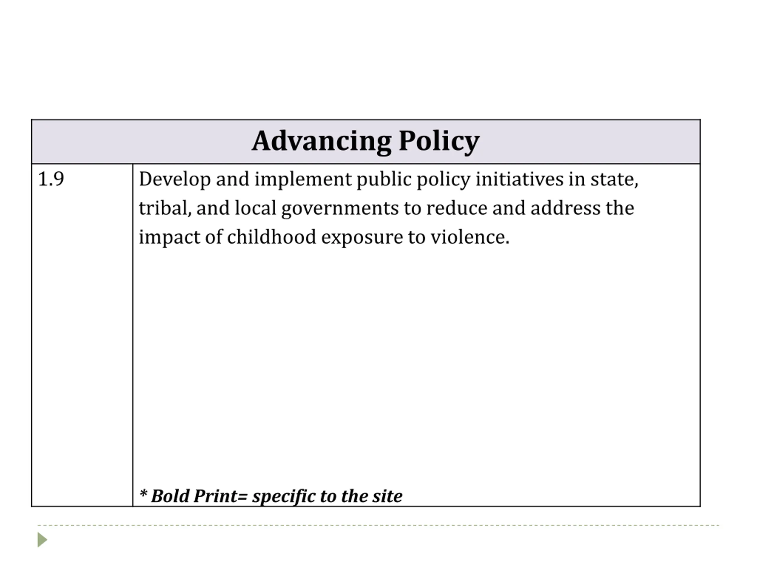 Advancing Policy Develop and implement public policy initiatives in state, tribal, and local governments to reduce and address the impact of childhood exposure to violence. 1.9 * Bold Print= specific to the site