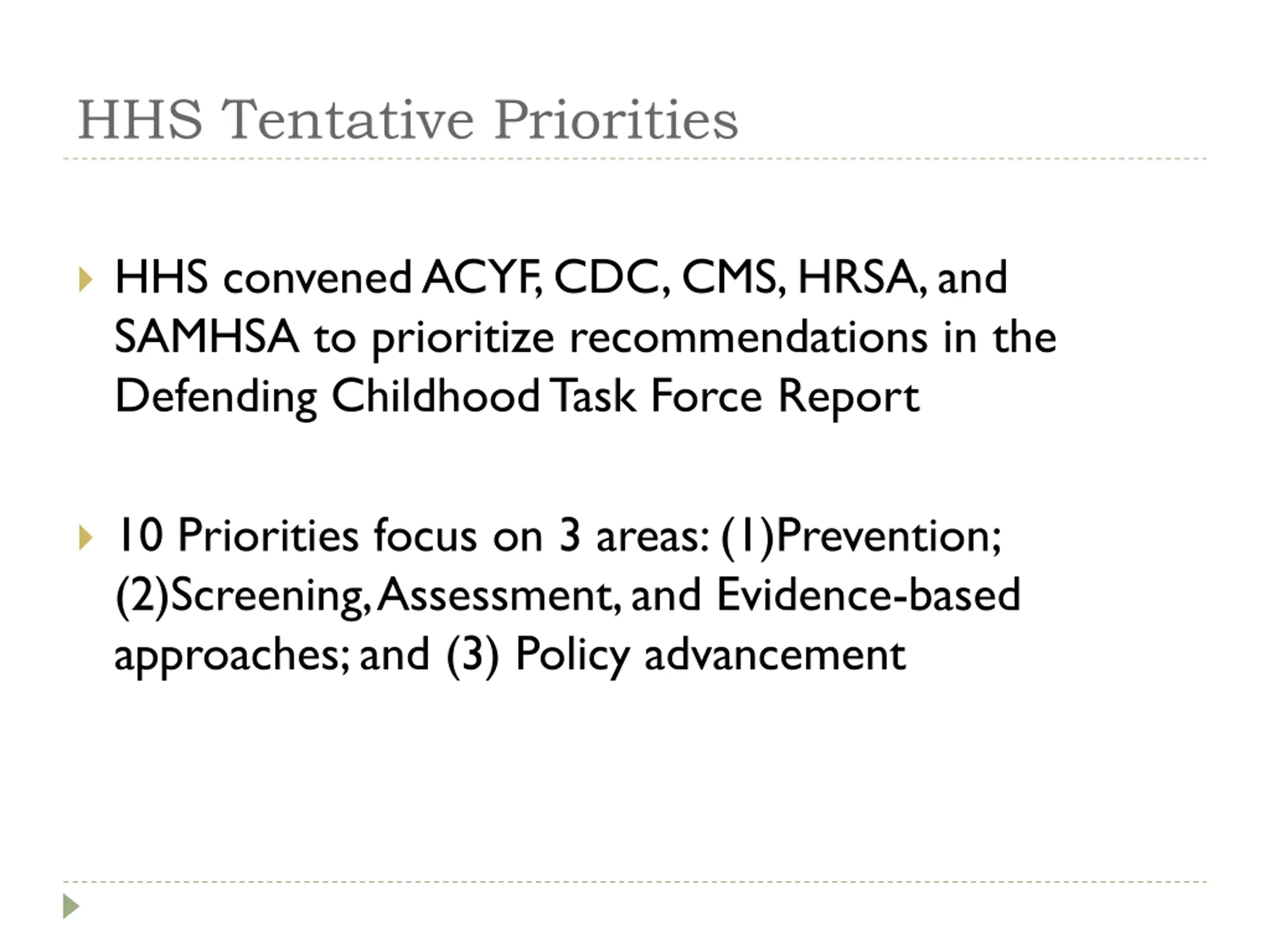 HHS Tentative Priorities HHS convened ACYF, CDC, CMS, HRSA, and SAMHSA to prioritize recommendations in the Defending Childhood Task Force Report 10 Priorities focus on 3 areas: (1)Prevention; (2)Screening, Assessment, and Evidence-based approaches; and (3) Policy advancement