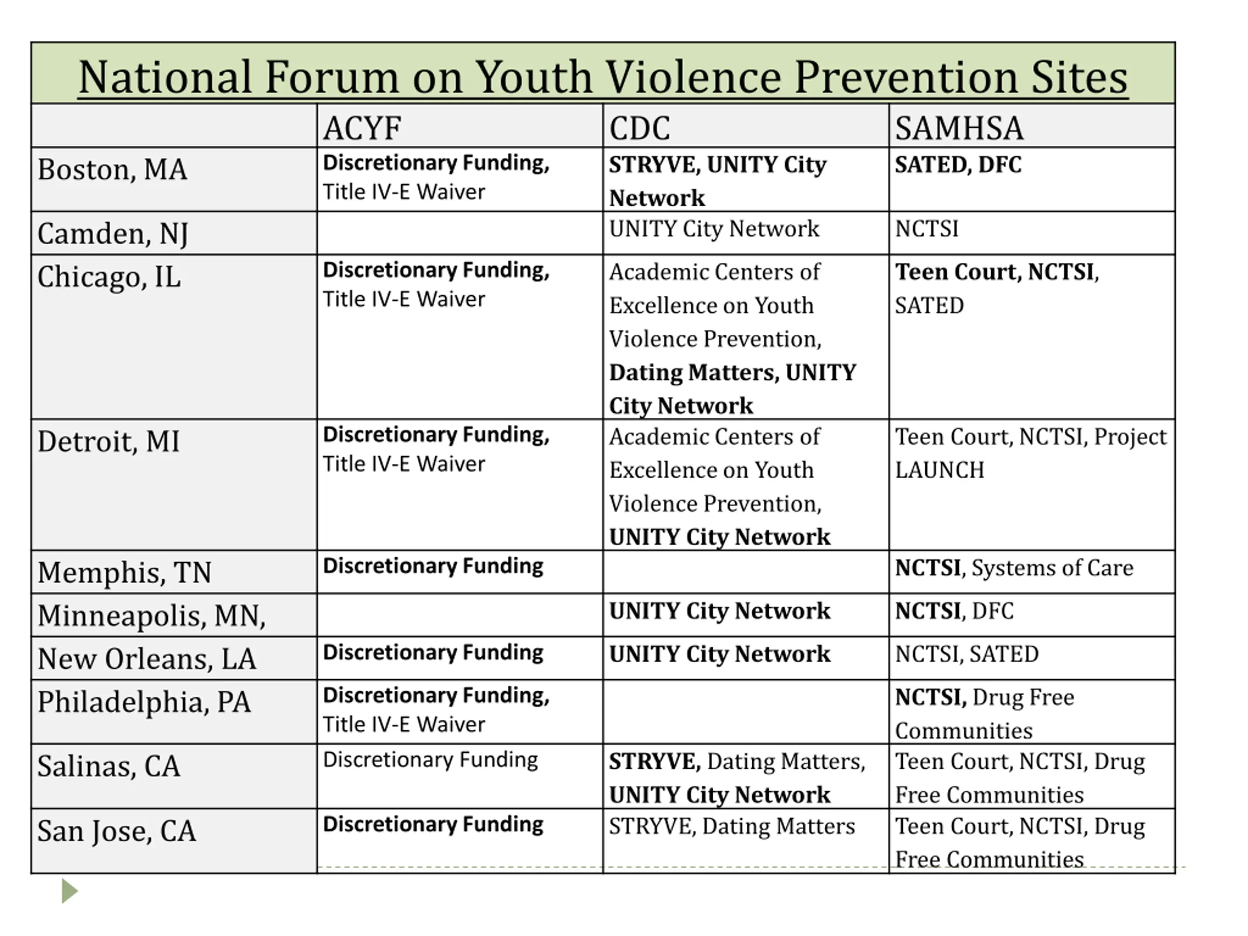 National Forum on Youth Violence Prevention Sites ACYF Boston, MA Discretionary Funding, Title IV-E Waiver Camden, NJ Chicago, IL Discretionary Funding, Title IV-E Waiver CDC STRYVE, UNITY City Network UNITY City Network SAMHSA SATED, DFC NCTSI Academic Centers of Excellence on Youth Violence Prevention, Dating Matters, UNITY City Network Academic Centers of Excellence on Youth Violence Prevention, UNITY City Network Teen Court, NCTSI, SATED Teen Court, NCTSI, Project LAUNCH Detroit, MI Discretionary Funding, Title IV-E Waiver NCTSI, Systems of Care Memphis, TN Minneapolis, MN, New Orleans, LA Philadelphia, PA Discretionary Funding UNITY City Network NCTSI, DFC UNITY City Network NCTSI, SATED Discretionary Funding NCTSI, Drug Free Communities Teen Court, NCTSI, Drug Free Communities Teen Court, NCTSI, Drug Free Communities Discretionary Funding, Title IV-E Waiver Discretionary Funding STRYVE, Dating Matters, UNITY City Network STRYVE, Dating Matters Salinas, CA San Jose, CA Discretionary Funding