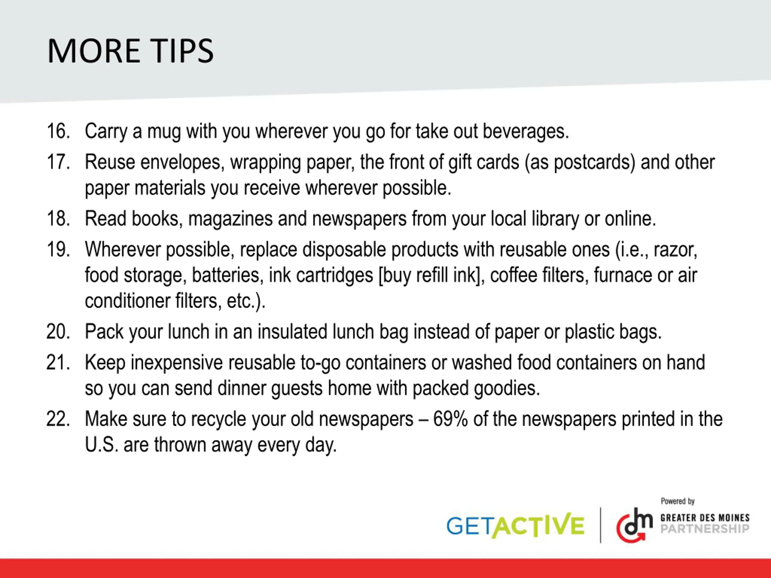 MORE TIPS 16. Carry a mug with you wherever you go for take out beverages. 17. Reuse envelopes, wrapping paper, the front of gift cards (as postcards) and other paper materials you receive wherever possible. 18. Read books, magazines and newspapers from your local library or online. 19. Wherever possible, replace disposable products with reusable ones (i.e., razor, food storage, batteries, ink cartridges [buy refill ink], coffee filters, furnace or air conditioner filters, etc.). 20. Pack your lunch in an insulated lunch bag instead of paper or plastic bags. 21. Keep inexpensive reusable to-go containers or washed food containers on hand so you can send dinner guests home with packed goodies. 22. Make sure to recycle your old newspapers 69% of the newspapers printed in the U.S. are thrown away every day.