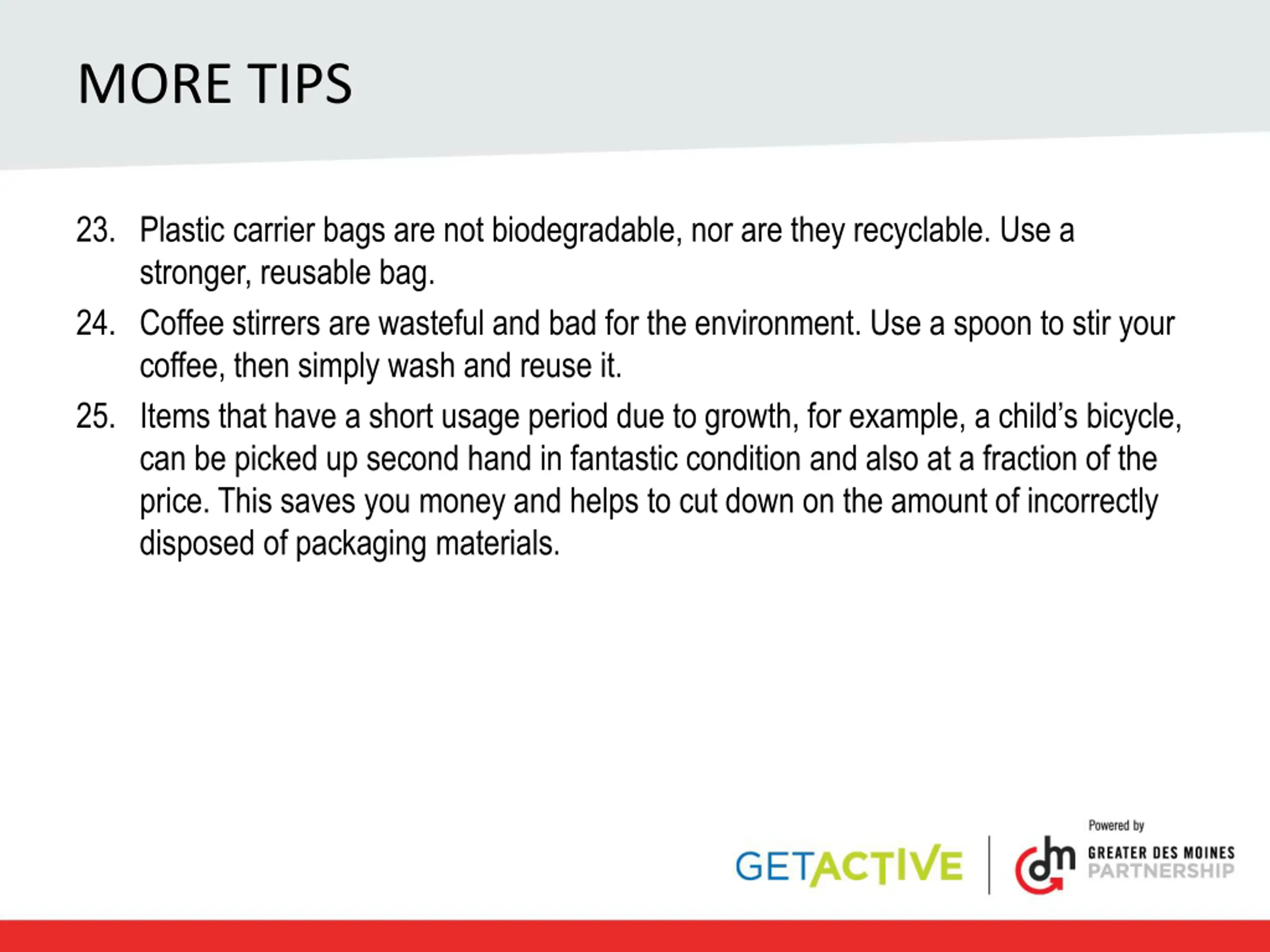 MORE TIPS 23. Plastic carrier bags are not biodegradable, nor are they recyclable. Use a stronger, reusable bag. 24. Coffee stirrers are wasteful and bad for the environment. Use a spoon to stir your coffee, then simply wash and reuse it. 25. Items that have a short usage period due to growth, for example, a child s bicycle, can be picked up second hand in fantastic condition and also at a fraction of the price. This saves you money and helps to cut down on the amount of incorrectly disposed of packaging materials.
