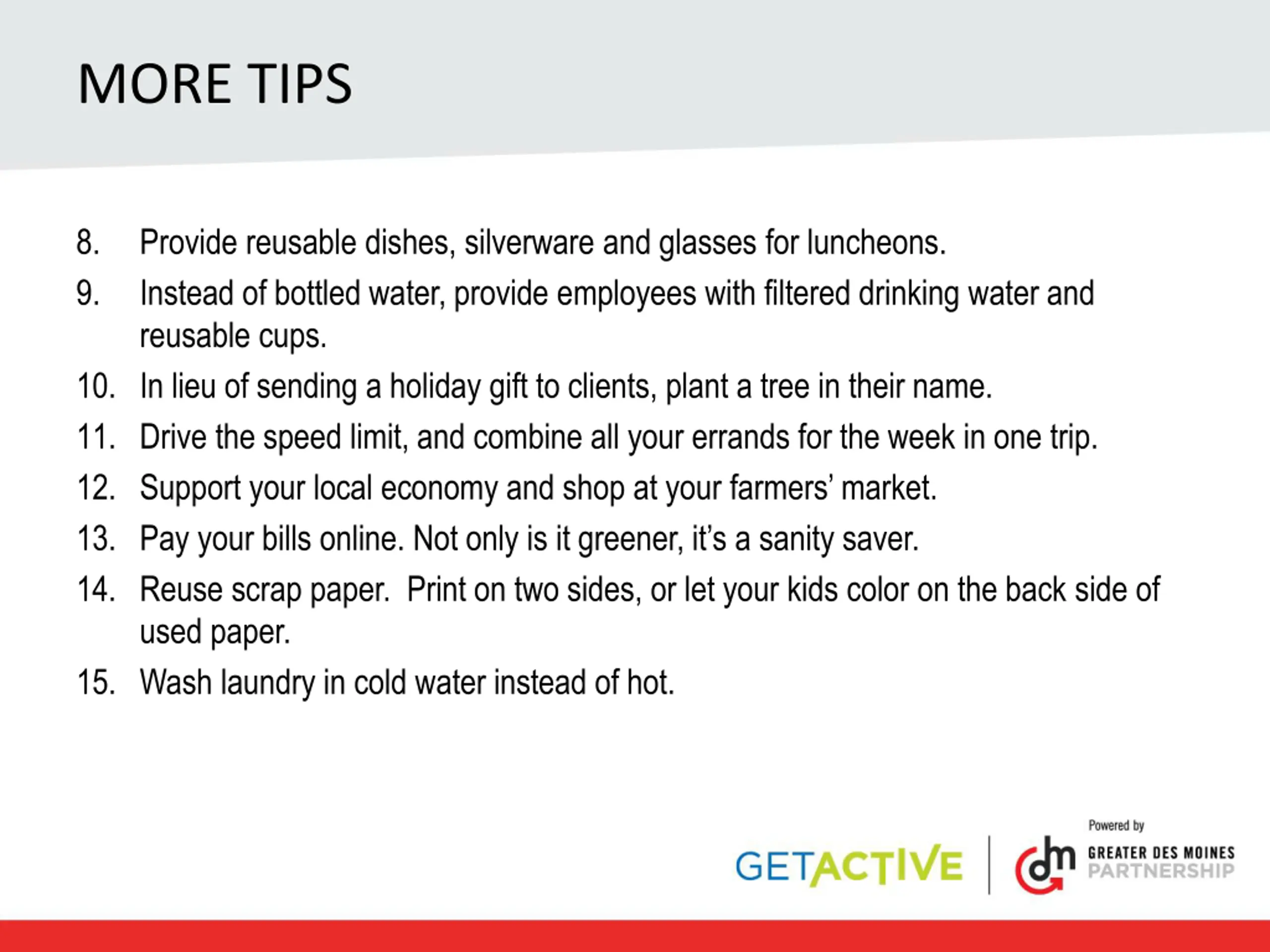 MORE TIPS 8. 9. Provide reusable dishes, silverware and glasses for luncheons. Instead of bottled water, provide employees with filtered drinking water and reusable cups. 10. In lieu of sending a holiday gift to clients, plant a tree in their name. 11. Drive the speed limit, and combine all your errands for the week in one trip. 12. Support your local economy and shop at your farmers market. 13. Pay your bills online. Not only is it greener, it s a sanity saver. 14. Reuse scrap paper. Print on two sides, or let your kids color on the back side of used paper. 15. Wash laundry in cold water instead of hot.