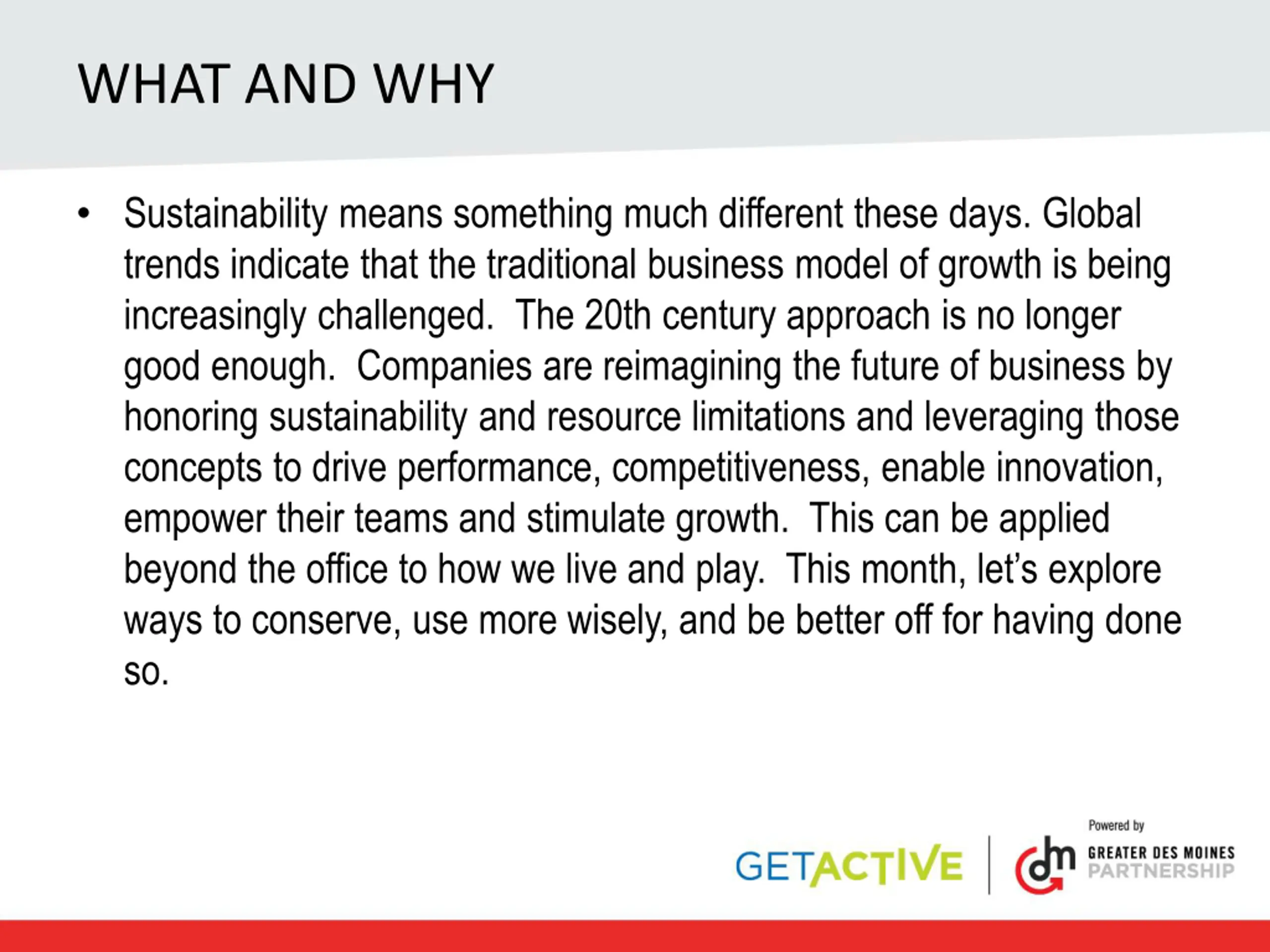 WHAT AND WHY Sustainability means something much different these days. Global trends indicate that the traditional business model of growth is being increasingly challenged. The 20th century approach is no longer good enough. Companies are reimagining the future of business by honoring sustainability and resource limitations and leveraging those concepts to drive performance, competitiveness, enable innovation, empower their teams and stimulate growth. This can be applied beyond the office to how we live and play. This month, let s explore ways to conserve, use more wisely, and be better off for having done so.