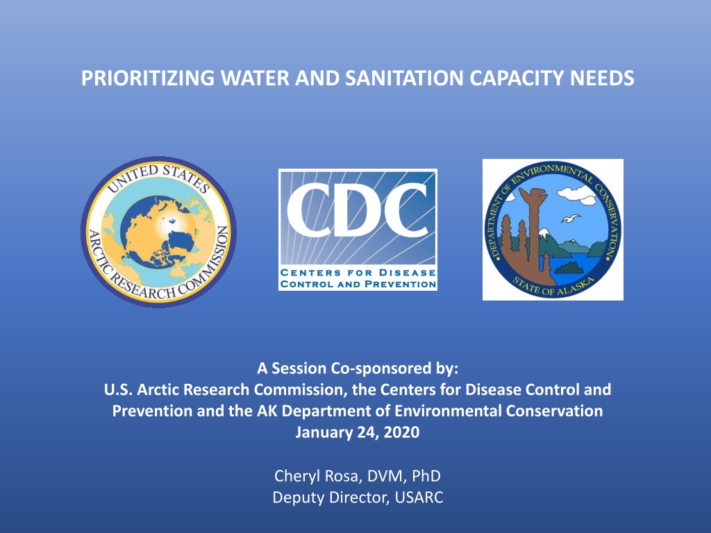 PRIORITIZING WATER AND SANITATION CAPACITY NEEDS A Session Co-sponsored by: U.S. Arctic Research Commission, the Centers for Disease Control and Prevention and the AK Department of Environmental Conservation January 24, 2020 Cheryl Rosa, DVM, PhD Deputy Director, USARC