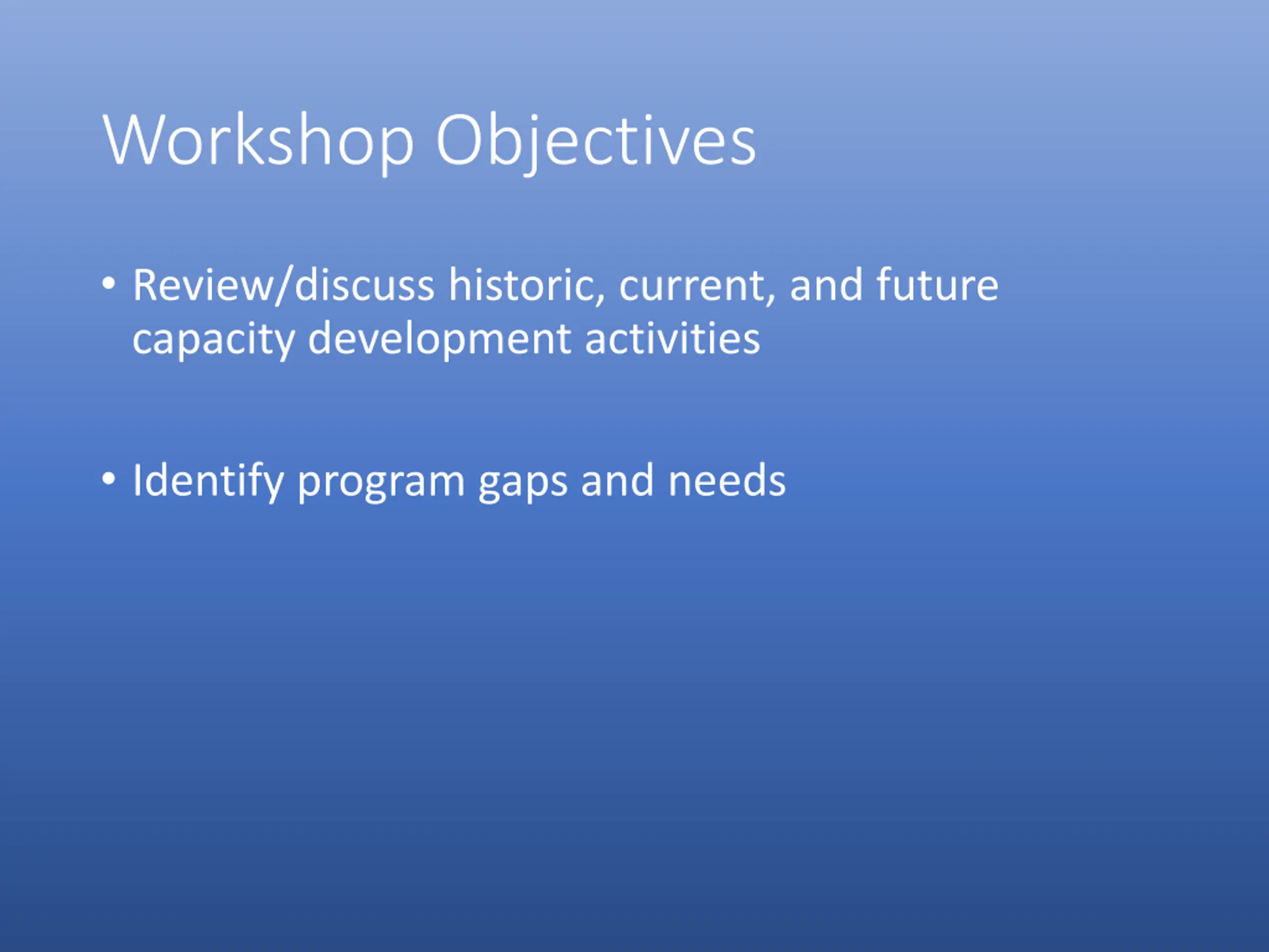 Workshop Objectives Review/discuss historic, current, and future capacity development activities Identify program gaps and needs