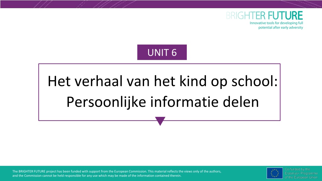 UNIT 6 Het verhaal van het kind op school: Persoonlijke informatie delen The BRIGHTER FUTURE project has been funded with support from the European Commission. This material reflects the views only of the authors, and the Commission cannot be held responsible for any use which may be made of the information contained therein. and the Commission cannot be held responsible for any use which may be made of the information contained therein. The BRIGHTER FUTURE project has been funded with support from the European Commission. This material reflects the views only of the authors,