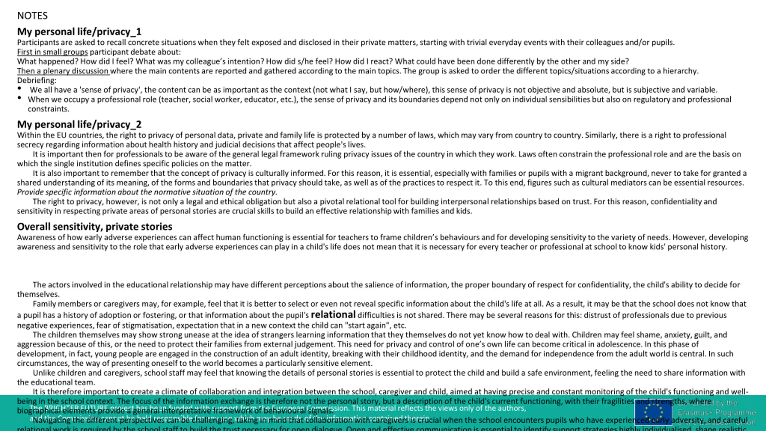 NOTES My personal life/privacy_1 Participants are asked to recall concrete situations when they felt exposed and disclosed in their private matters, starting with trivial everyday events with their colleagues and/or pupils. First in small groups participant debate about: What happened? How did I feel? What was my colleague s intention? How did s/he feel? How did I react? What could have been done differently by the other and my side? Then a plenary discussion where the main contents are reported and gathered according to the main topics. The group is asked to order the different topics/situations according to a hierarchy. Debriefing: We all have a 'sense of privacy', the content can be as important as the context (not what I say, but how/where), this sense of privacy is not objective and absolute, but is subjective and variable. When we occupy a professional role (teacher, social worker, educator, etc.), the sense of privacy and its boundaries depend not only on individual sensibilities but also on regulatory and professional constraints. My personal life/privacy_2 Within the EU countries, the right to privacy of personal data, private and family life is protected by a number of laws, which may vary from country to country. Similarly, there is a right to professional secrecy regarding information about health history and judicial decisions that affect people's lives. It is important then for professionals to be aware of the general legal framework ruling privacy issues of the country in which they work. Laws often constrain the professional role and are the basis on which the single institution defines specific policies on the matter. It is also important to remember that the concept of privacy is culturally informed. For this reason, it is essential, especially with families or pupils with a migrant background, never to take for granted a shared understanding of its meaning, of the forms and boundaries that privacy should take, as well as of the practices to respect it. To this end, figures such as cultural mediators can be essential resources. Provide specific information about the normative situation of the country. The right to privacy, however, is not only a legal and ethical obligation but also a pivotal relational tool for building interpersonal relationships based on trust. For this reason, confidentiality and sensitivity in respecting private areas of personal stories are crucial skills to build an effective relationship with families and kids. Overall sensitivity, private stories Awareness of how early adverse experiences can affect human functioning is essential for teachers to frame children s behavioursand for developing sensitivity to the variety of needs. However, developing awareness and sensitivity to the role that early adverse experiences can play in a child's life does not mean that it is necessary for every teacher or professional at school to know kids' personal history. The actors involved in the educational relationship may have different perceptions about the salience of information, the proper boundary of respect for confidentiality, the child's ability to decide for themselves. Family members or caregivers may, for example, feel that it is better to select or even not reveal specific information about the child's life at all. As a result, it may be that the school does not know that a pupil has a history of adoption or fostering, or that information about the pupil's relational difficulties is not shared. There may be several reasons for this: distrust of professionals due to previous negative experiences, fear of stigmatisation, expectation that in a new context the child can "start again", etc. The children themselves may show strong unease at the idea of strangers learning information that they themselves do not yet know how to deal with. Children may feel shame, anxiety, guilt, and aggression because of this, or the need to protect their families from external judgement. This need for privacy and control of one s own life can become critical in adolescence. In this phase of development, in fact, young people are engaged in the construction of an adult identity, breaking with their childhood identity,and the demand for independence from the adult world is central. In such circumstances, the way of presenting oneself to the world becomes a particularly sensitive element. Unlike children and caregivers, school staff may feel that knowing the details of personal stories is essential to protect the child and build a safe environment, feeling the need to share information with the educational team. It is therefore important to create a climate of collaboration and integration between the school, caregiver and child, aimed at having precise and constant monitoring of the child's functioning and well- being in the school context. The focus of the information exchange is therefore not the personal story, but a description of the child's current functioning, with their fragilities and strengths, where biographical elements provide a general interpretative framework of behavioural signals. The BRIGHTER FUTURE project has been funded with support from the European Commission. This material reflects the views only of the authors, and the Commission cannot be held responsible for any use which may be made of the information contained therein. Navigating the different perspectives can be challenging, taking in mind that collaboration with caregivers is crucial when the school encounters pupils who have experienced early adversity, and careful relational work is required by the school staff to build the trust necessary for open dialogue. Open and effective communicationis essential to identify support strategies highly individualised, shape realistic